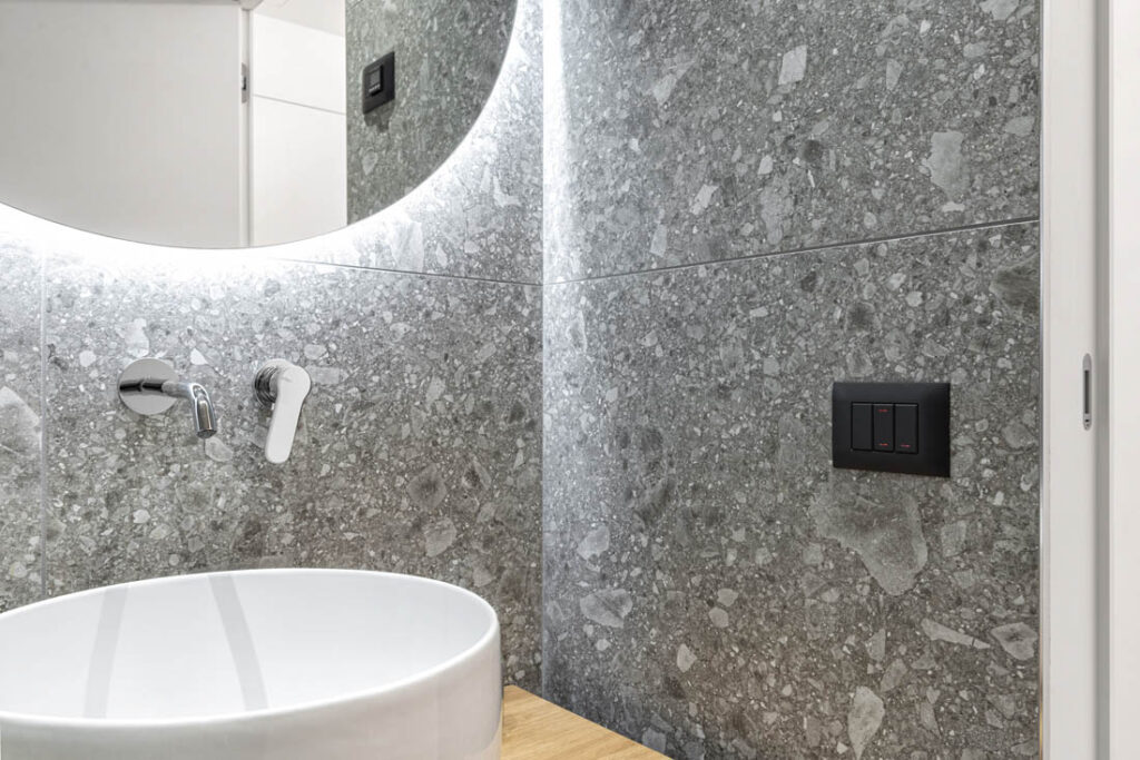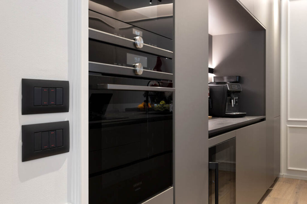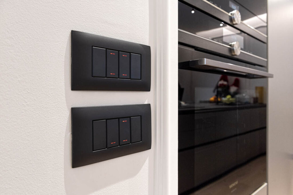 A completamento del sistema troviamo le placche elettriche Young 44 che, grazie al loro design pulito e minimalista, si adattano perfettamente allo stile contemporaneo dell’appartamento, aggiungendo un tocco di raffinatezza ad ogni parete.