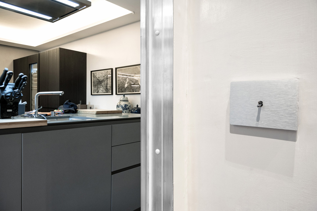 La collezione Ave New Style 44 recupera il sistema di accensione e spegnimento a levetta rendendolo di nuovo attuale in una sintesi perfetta fra tecnologia e design. Tra le due diverse varianti disponibili con placca in alluminio spazzolato, in questa abitazione si è optato per la colorazione naturale (l’altra è di color antracite) dove s’innestano i caratteristici comandi a levetta color cromo, con ghiera abbinata, che regalano un nuovo contatto con la luce. Il sistema di accensione a levetta integra infatti il meglio della tecnologia AVE: deviatori, commutatori ed interruttori illuminabili con relativo feedback di stato.