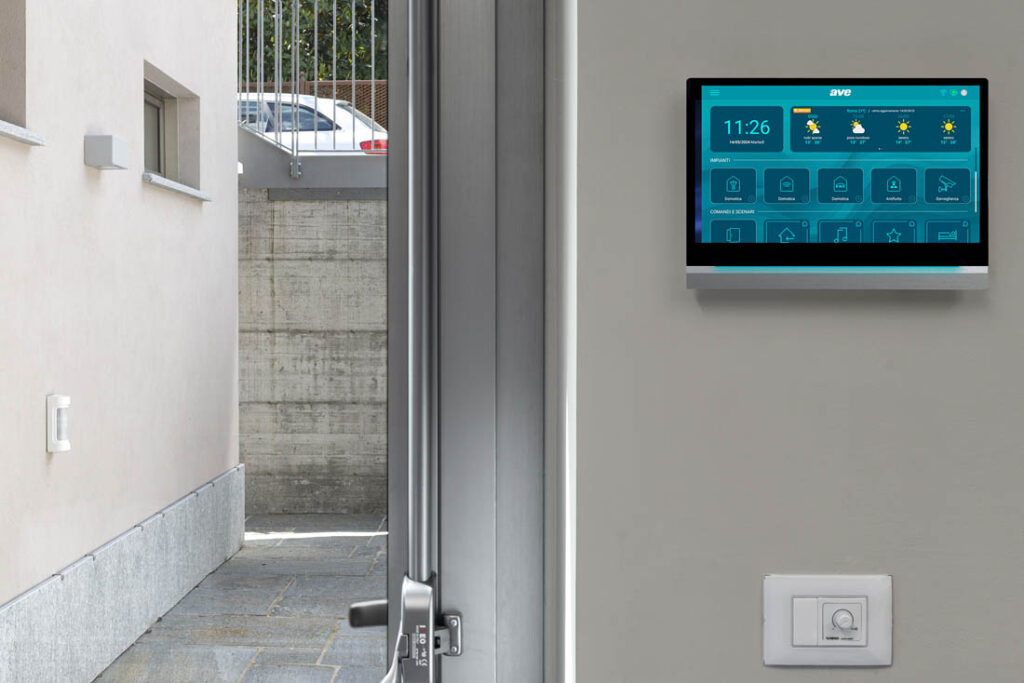 I supervisori touch screen AVE da 10″ svolgono un ruolo centrale. Questi dispositivi sono infatti pensati per supervisionare ogni aspetto restituendo la gestione completa del sistema domotico e delle sue funzioni (illuminazione, temperatura, scenari, ecc.), ma anche dell’antifurto, delle chiamate videocitofoniche, delle telecamere IP; offrendo inoltre la visualizzazione delle previsioni meteo locali. La struttura bi-materiale in alluminio e vetro, abbinata ad un design ultrasottile, con una sporgenza di soli 9 mm dalla parete, conferisce loro un aspetto moderno e raffinato.