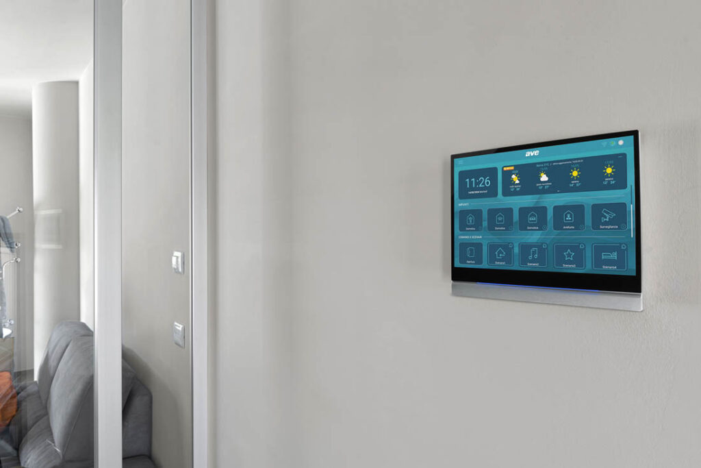 I supervisori touch screen AVE da 10″ svolgono un ruolo centrale. Questi dispositivi sono infatti pensati per supervisionare ogni aspetto restituendo la gestione completa del sistema domotico e delle sue funzioni (illuminazione, temperatura, scenari, ecc.), ma anche dell’antifurto, delle chiamate videocitofoniche, delle telecamere IP; offrendo inoltre la visualizzazione delle previsioni meteo locali. La struttura bi-materiale in alluminio e vetro, abbinata ad un design ultrasottile, con una sporgenza di soli 9 mm dalla parete, conferisce loro un aspetto moderno e raffinato.