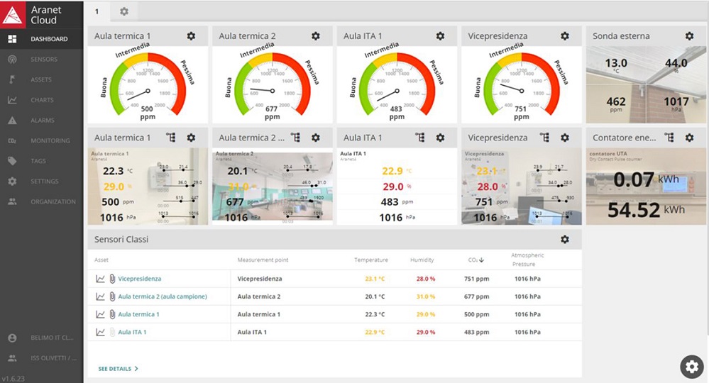Oltre ai sensori ambiente, consultabili individualmente tramite bluetooth mediante l’app gratuita aranet4, sono stati installati altri sensori per la misurazione di consumi elettrici dell’impianto di ventilazione ed una Base station Aranet PRO. Quest’ultima si collega via radio con ciascun sensore (fino a 100 dispositivi AranetPro o altri sensori), registrando e conservando tutti i valori misurati nelle diverse stanze. Grazie al web server e al software di analisi dati integrato nella base station è possibile effettuare una gestione avanzata delle letture dei diversi dispositivi in loco e, mediante la connessione all’Aranet Cloud, è possibile realizzare facilmente le proprie dashboard personalizzate e tenere sotto controllo diverse installazioni da remoto.