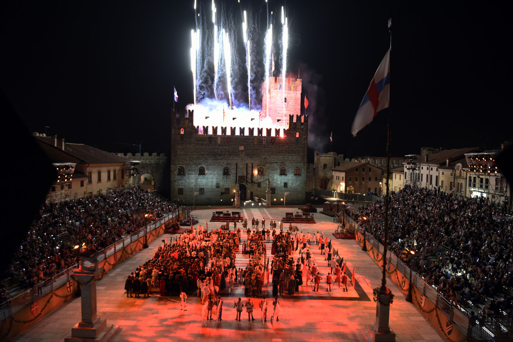 Un’epopea d’amore senza tempo che da oltre sessant’anni conquista spettatori da ogni parte del mondo. Il resto lo fa la naturale scenografia, una delle piazze più belle d’Italia, incorniciata da due castelli medioevali e circondata dalle loro mura, fra le più ammirate del Veneto. Qui, oltre seicento figuranti in costume storico rievocano – in una cornice di giochi di luce, acrobati, giocolieri e sbandieratori – la sfida che, secondo la leggenda, due valorosi cavalieri affrontarono per ottenere la mano di una giovane dama, da conquistare non con la spada ma con il nobile gioco degli scacchi.