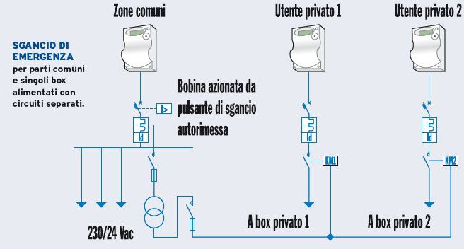Nel caso in cui l’autorimessa sia pubblica oppure sia coperta di superficie superiore a 300 m2, occorre prevedere in posizione facilmente accessibile e/o in locale presidiato un comando per lo sgancio di emergenza. Qualora le parti comuni ed i singoli box siano alimentati con circuiti separati (caso tipico di un’autorimessa condominiale), il comando di emergenza dovrà togliere tensione a tutte le sorgenti di alimentazione.