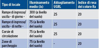 L’impianto di illuminazione deve garantire, a seconda del luogo di installazione, livelli di illuminamento e di comfort visivi sufficienti. Indicativamente si possono consigliare i seguenti valori tratti dalla norma UNI EN 12464-1:
