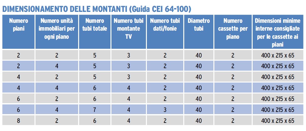 Per determinare il numero e la dimensione delle tubazioni in funzione del numero di unità immobiliari da collegare si può ricorrere alle indicazioni riportate nella Guida CEI 64-100, che tengono conto delle diverse tipologie di edificio in base al numero di piani ed al numero di unità immobiliari per piano presenti. All’interno, sono inoltre riportate anche le indicazioni relative alle dimensioni da adottare per le cassette di derivazione di ogni montante. Ovviamente tali dimensioni sono orientative e possono subire variazioni anche significative in base all’effettiva tipologia di prodotti disponibili sul mercato.