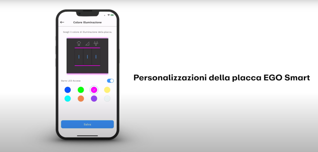 Caratterizzata dal design elegante e compatto e spessore ridotto, EGO Smart è disponibile in forme rettangolari e quadrate, con tre linee cromatiche (chiare, neutre e scure) per una palette di 12 colori satinati, abbinabili agli altri dispositivi ChoruSmart. I profili opalini diffondono la luce Led, aggiungendo un elemento identitario all’ambiente.