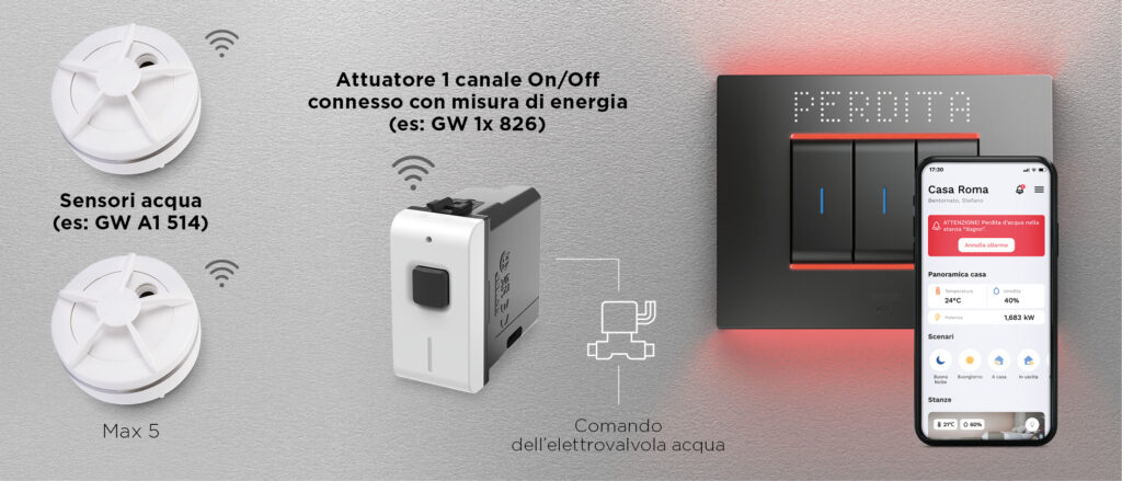 Il display integrato fornisce informazioni sullo stato dell’impianto e sui comandi disponibili, inclusi monitoraggio (scenari di benvenuto e arrivederci, stato delle luci e delle finestre), comfort (visualizzazione di temperatura e orario in stand-by), sicurezza (segnalazione di perdite d’acqua, rilevazione di fumo e gas, superamento dei livelli di umidità) e sostenibilità (superamento delle soglie di consumo e stato dei carichi).