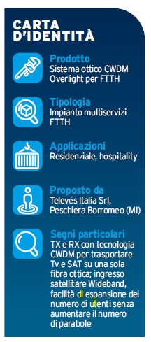 sistema OverlightTelevés Italia presenta il sistema Overlight: una serie di prodotti CWDM, trasmettitori (TX) e ricevitori (RX) ottici, idonei a distribuire i segnali tv terrestri e satellitari su una sola finestra ottica, con un alto rapporto di divisione; si riducono così gli apparati attivi e i costi di un impianto multiservizi ottico centralizzato Fiber To The Home (FTTH).