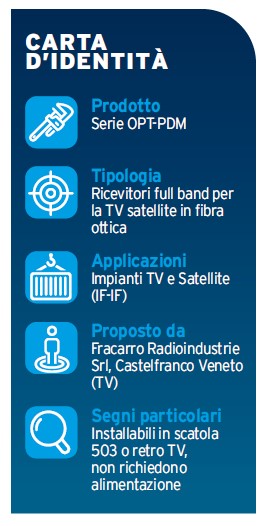 Con Fracarro, l’installatore può stare tranquillo perché dispone di una ricca gamma di soluzioni in fibra ottica, come questi nuovi ricevitori passivi per sistemi di piccole dimensioni, come anche di un servizio di assistenza completo, che include la progettazione e l’avviamento dell’impianto, il collaudo, il servizio di giunzione delle fibre ottiche e la realizzazione delle dichiarazioni di conformità».