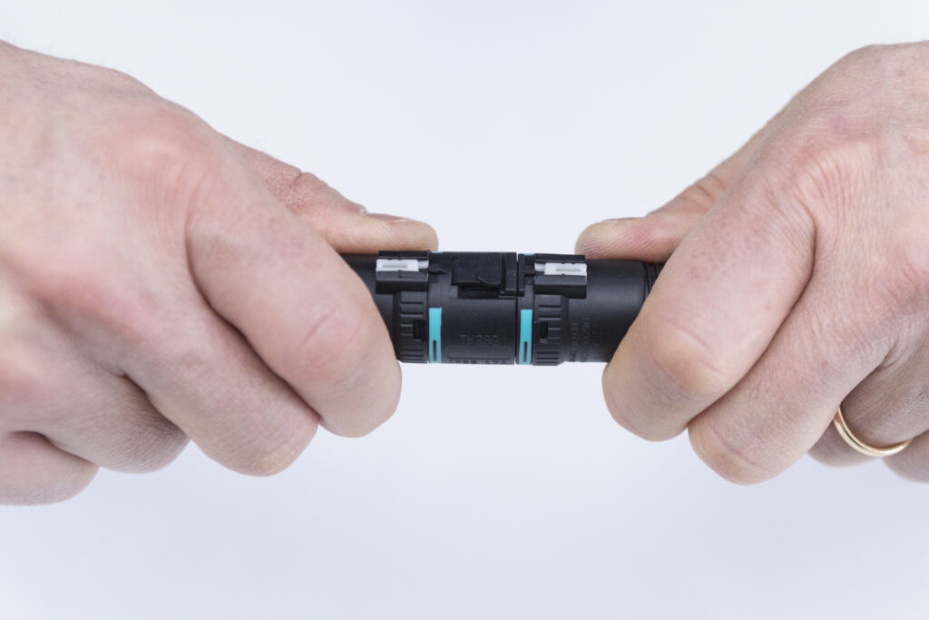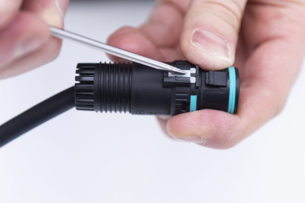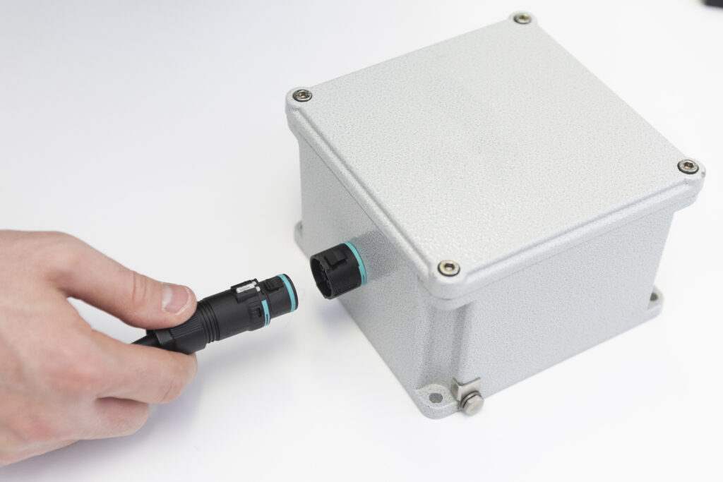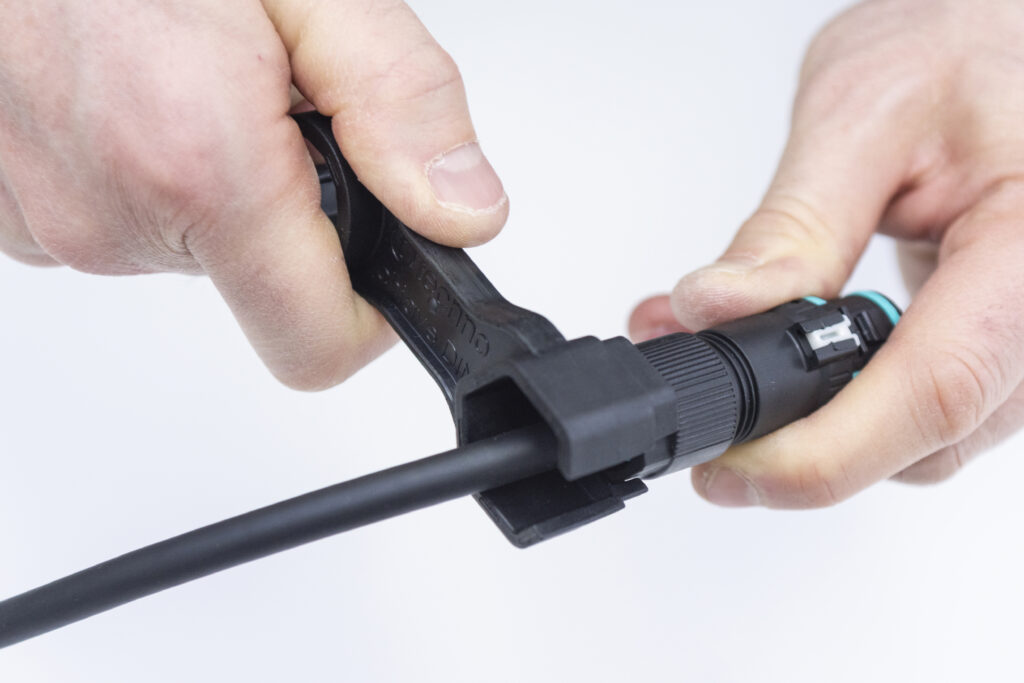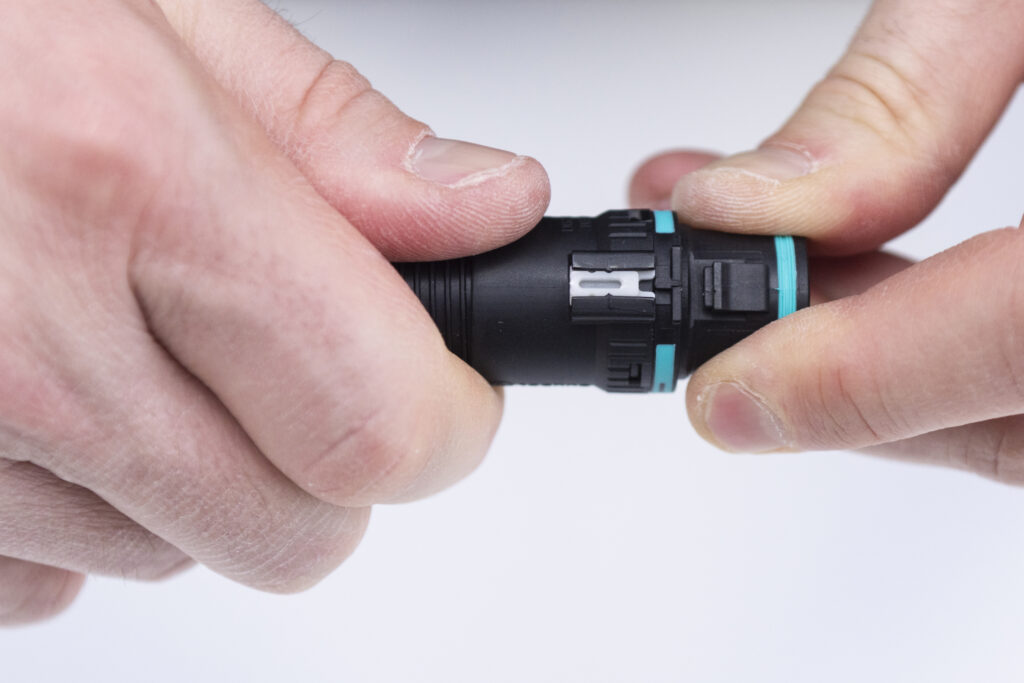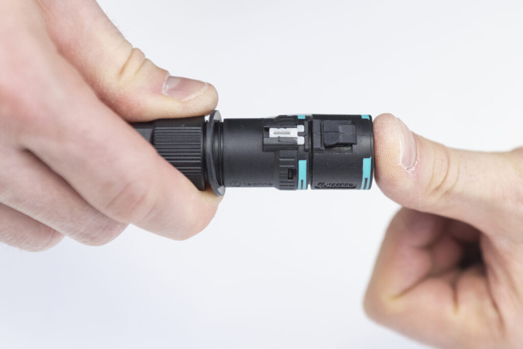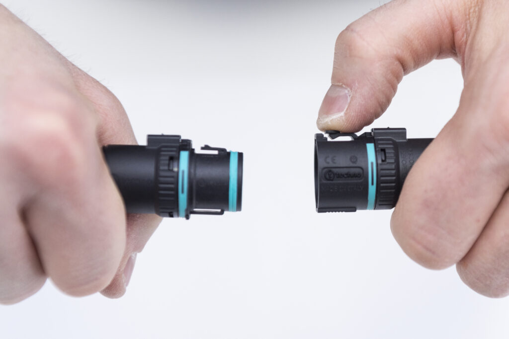 Il sistema di aggancio sviluppato appositamente da Techno per questa famiglia di connettori, denominato Easy-Click, consente la connessione e la disconnessione rapida dei connettori, molto più velocemente rispetto al fissaggio a vite e a baionetta. È sufficiente inserire la spina nella presa fino al raggiungimento del finecorsa: lo scatto di un apposito dente di aggancio, certificato per resistere a forze di trazione fino a 25 kg, garantisce non solo l’unione dei due componenti, ma anche l’estrema tenuta della connessione, azzerando il rischio di disconnessione accidentale mentre l’impianto è in funzione. È a prova di errore e manomissione anche il sistema di aggancio del pressacavo, non più basato sul fissaggio a vite, bensì su un gancio meccanico a baionetta abbinato a un cursore di blocco di sicurezza: basta inserirlo su presa e spina, ruotarlo fino a raggiungere il finecorsa, chiudere il tastino di sicurezza per completare l’installazione. Non occorrono utensili particolari per il montaggio, se non l’apposita chiave fornita da Techno.