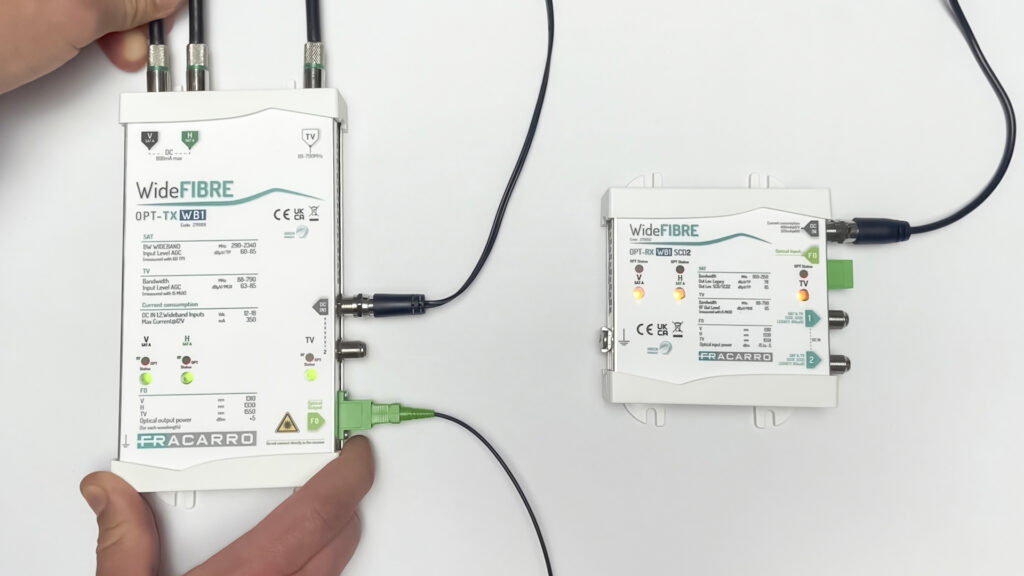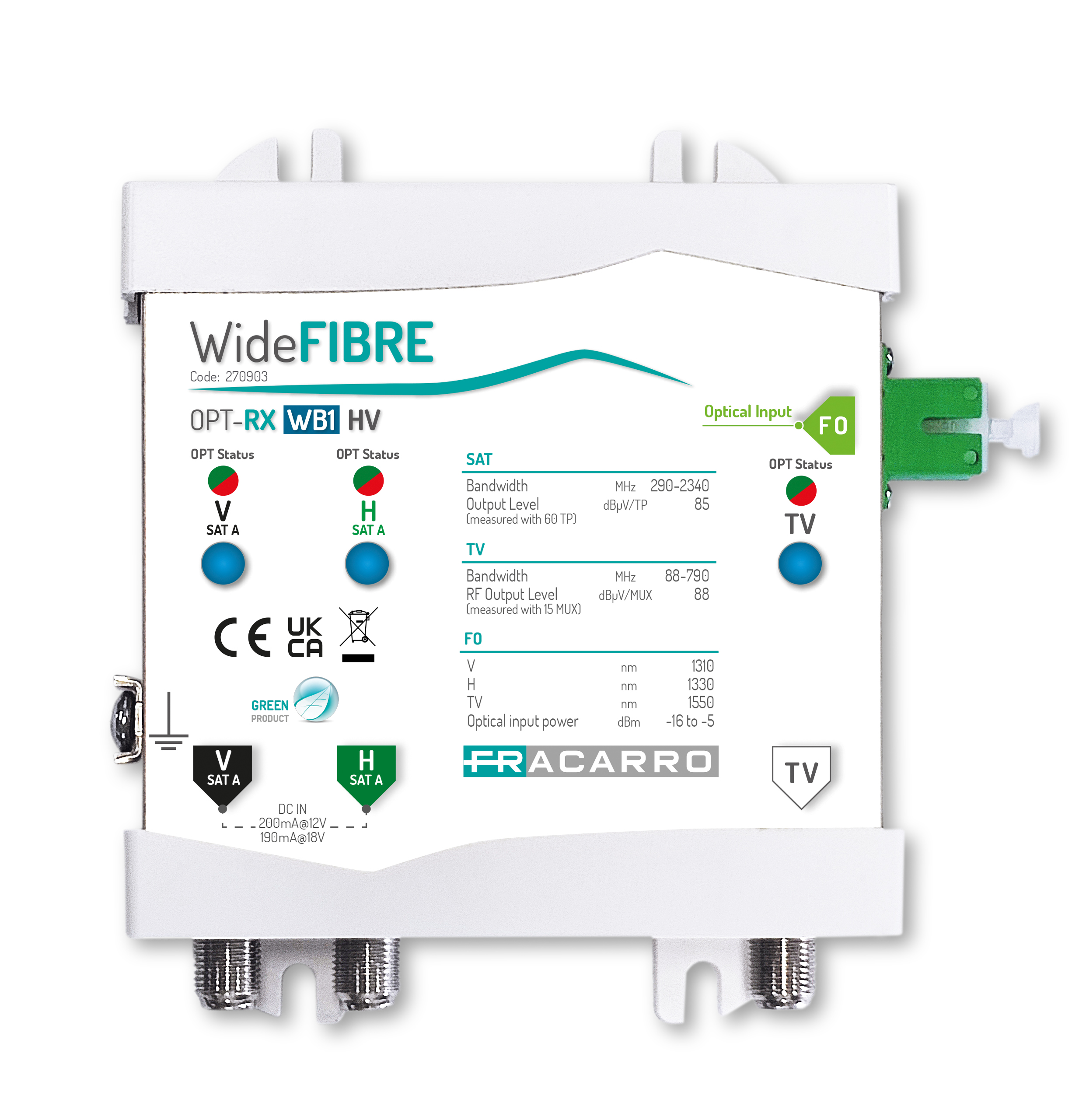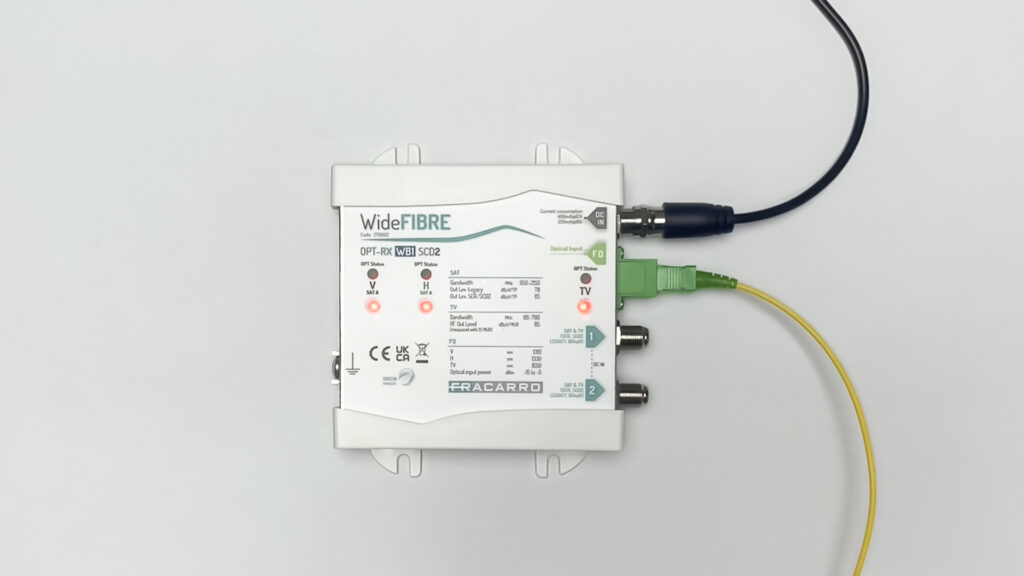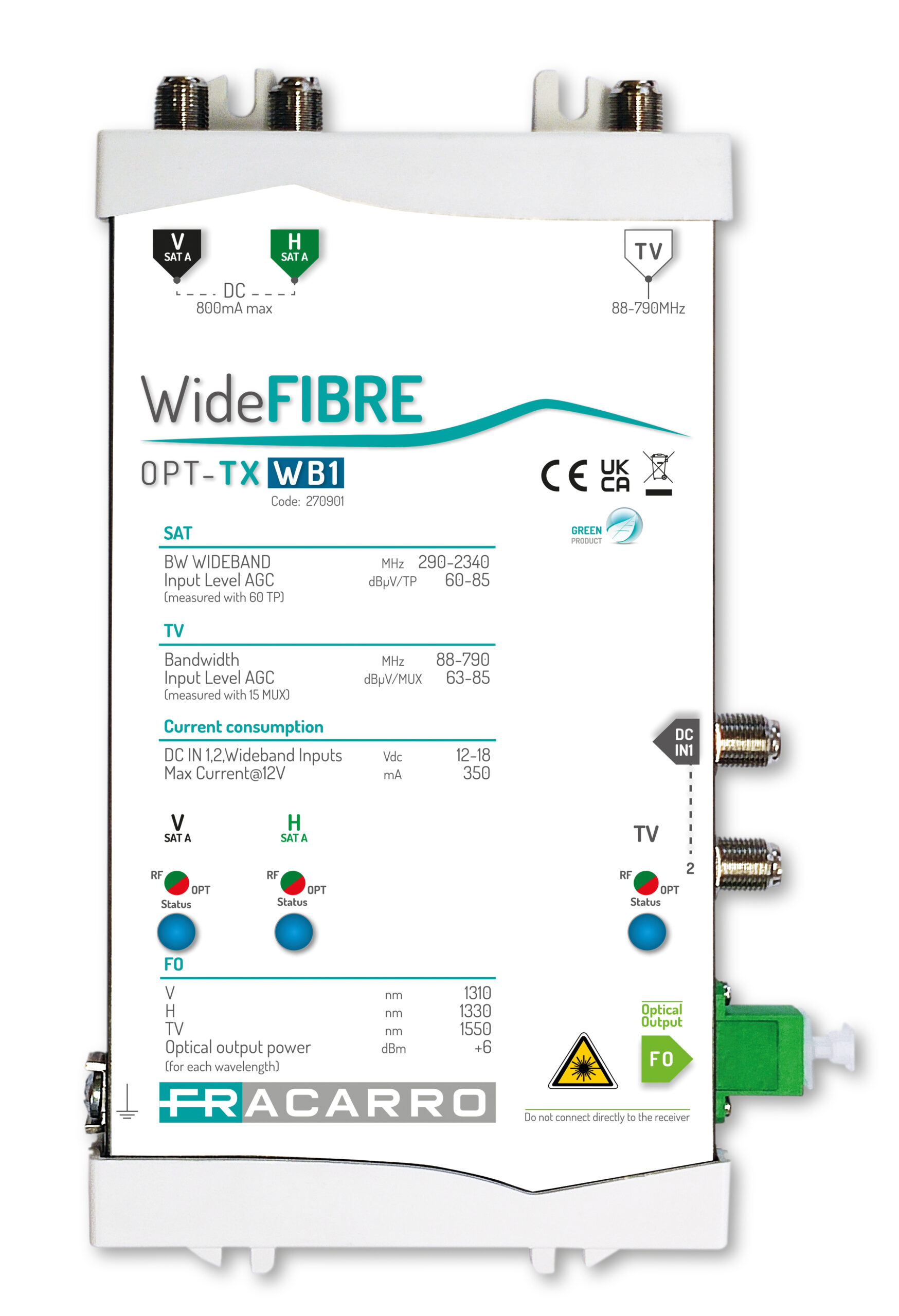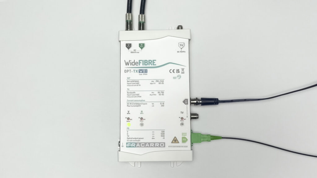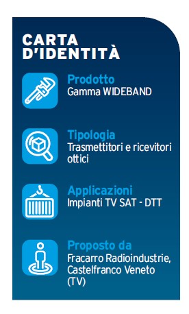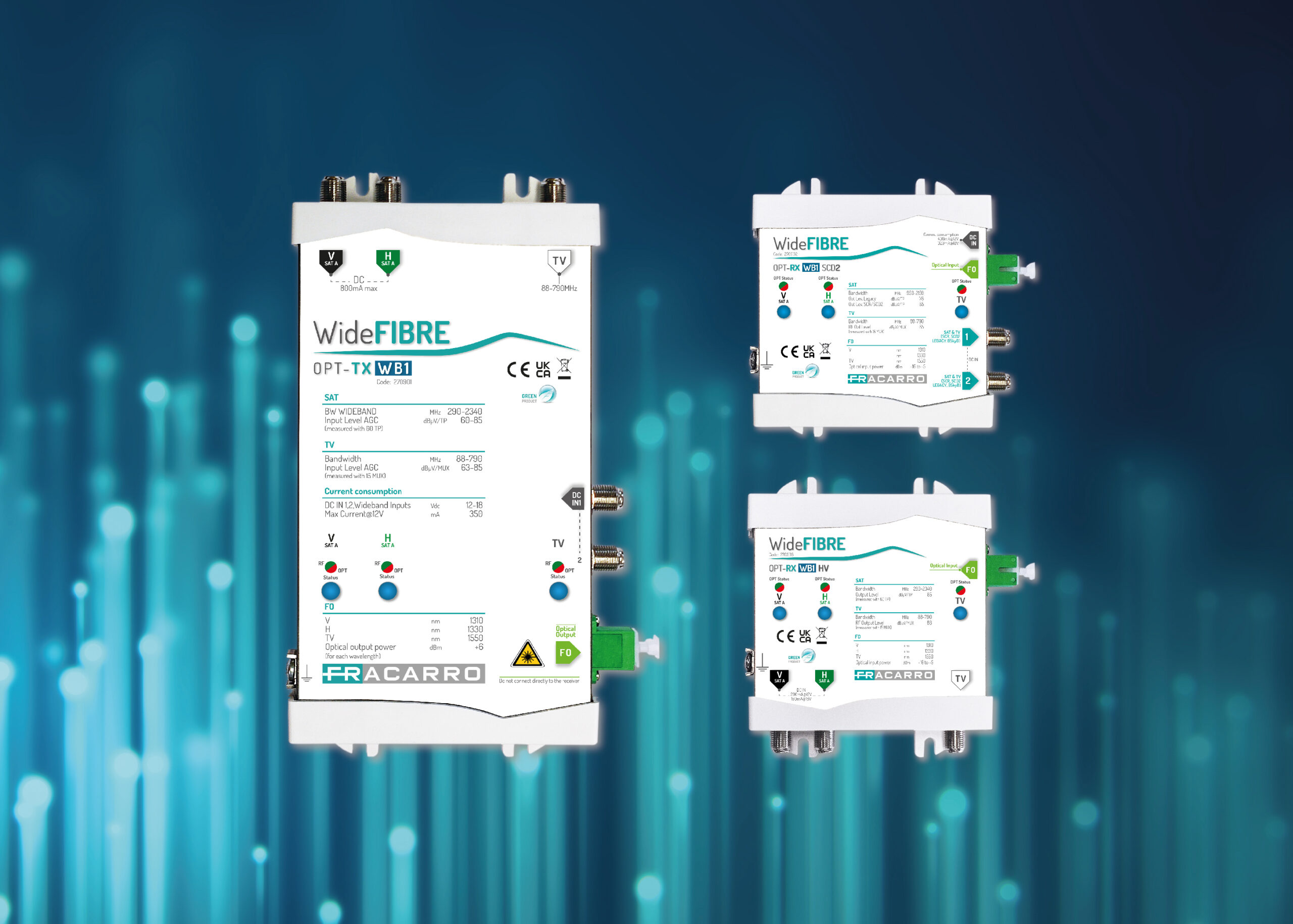 La gamma di trasmettitori e ricevitori ottici WIDEBAND Fracarro oggi comprende soluzioni per la gestione di una posizione satellitare completa più il segnale TV miscelato, ma nel corso dell’anno saranno a disposizione anche soluzioni in grado di gestire contemporaneamente fino a due satelliti completi più il segnale TV digitale terrestre.