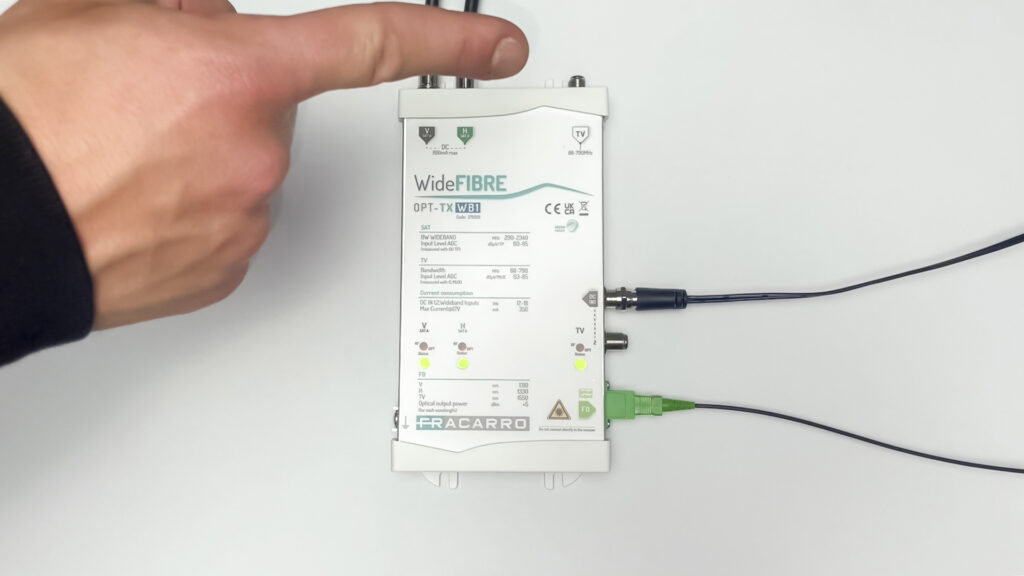 Il trasmettitore ottico OPT-TX WB1 ha il doppio connettore DC-in per l’alimentazione ridondante e il laser dedicato ad ogni sezione SAT (V-1310 nm, H-1330 nm) e TV (1550 nm).