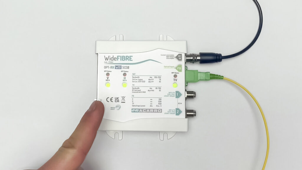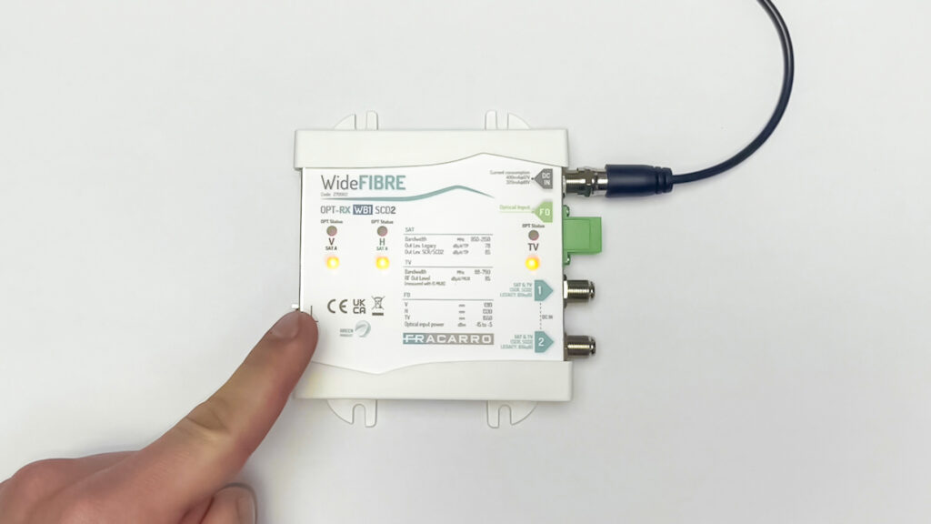 Il ricevitore ottico ha un connettore DC di ingresso per collegare l’alimentatore esterno (nella versione dCSS/SCR/Legacy). Si può alimentare anche tramite i connettori RF di uscita (in tutte le versioni). Il range ottico esteso (da -5 dBm a -16 dBm), permette lo splitting ottico fino a 1×64.