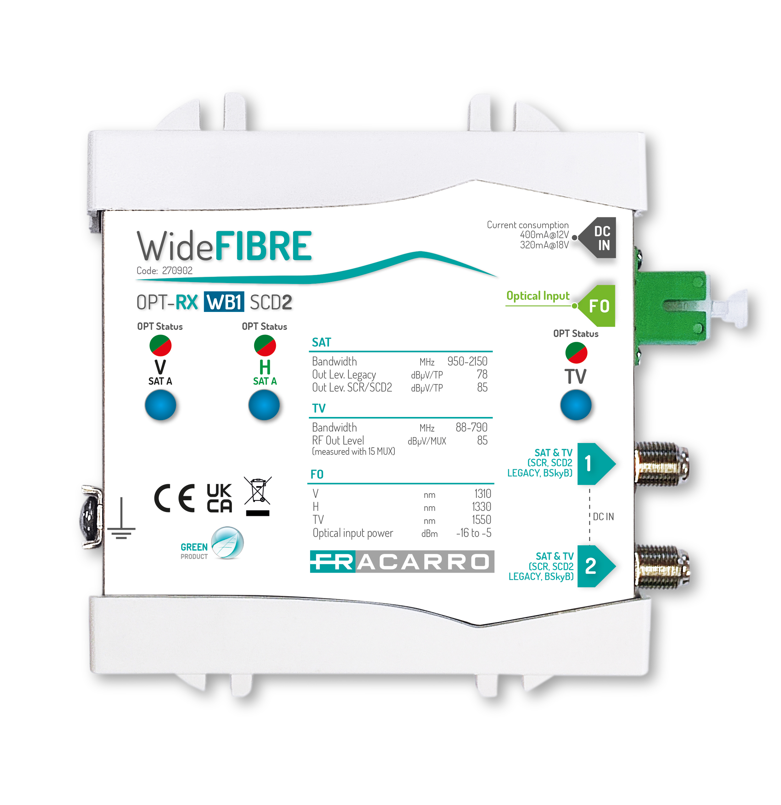 OPT-RX WB1 SCD2 (codice 270902) è il ricevitore SCD2 multistandard (SKY Q, BSkyB, SCR, Legacy) che consente la massima flessibilità di installazione ed è dotato di 2 uscite indipendenti dCSS/SCR/Legacy e del segnale TV digitale terrestre miscelato.
