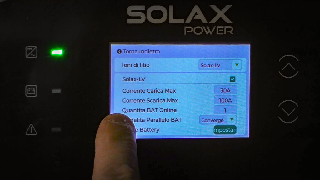 12 SETTAGGIO BMS: nel menù dedicato alla batteria, selezionare il tipo “Lithium-Ion”, flaggare “Solax-LV” (o la batteria specifica in uso) e impostare i parametri di carica e scarica (correnti) come da specifiche