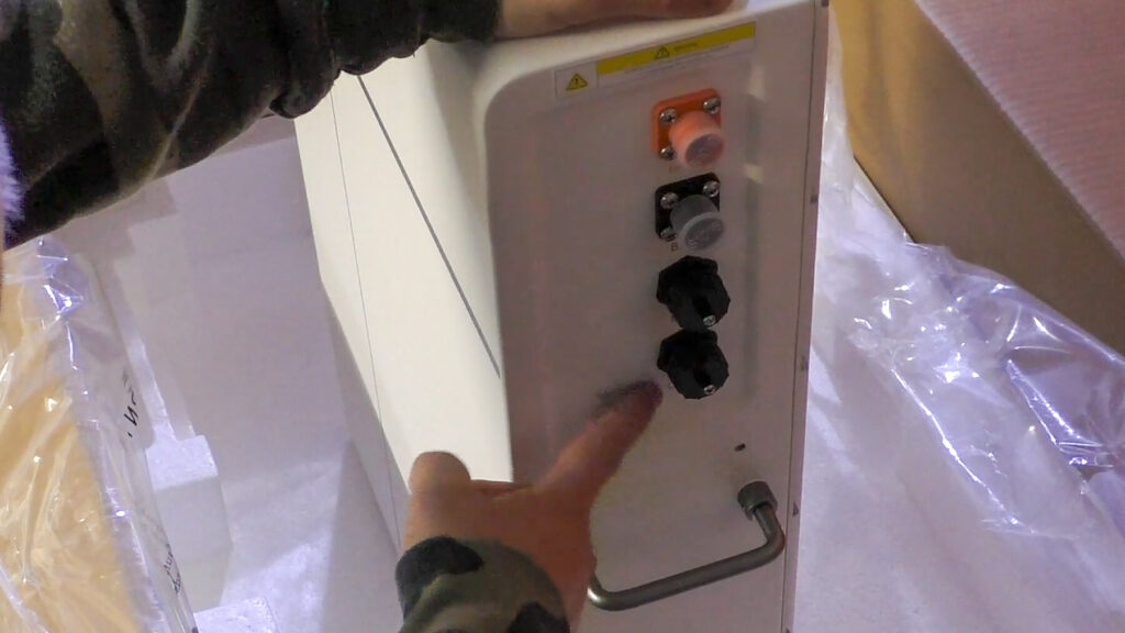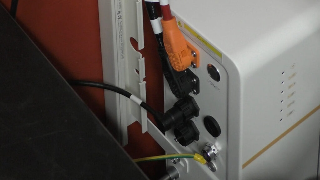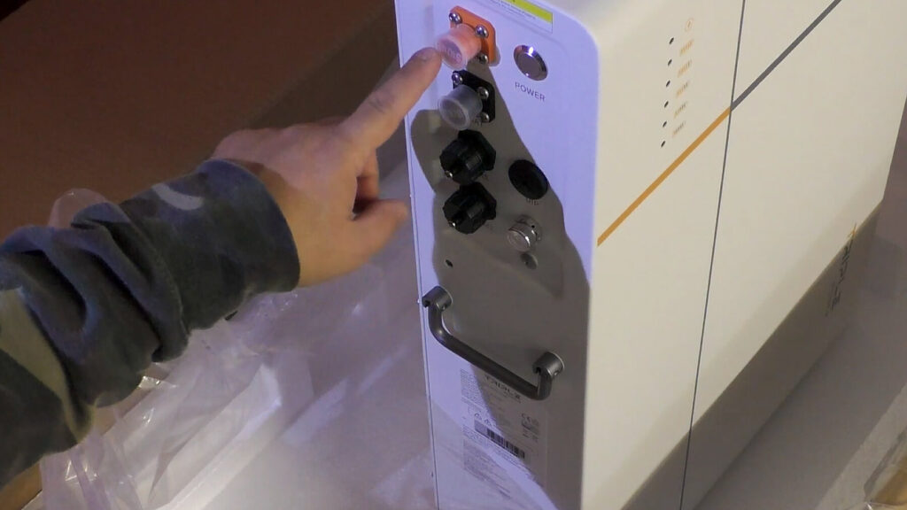 1 SUL LATO sinistro della batteria sono presenti: la connessione di potenza; il connettore BMS; la porta COM 2, la valvola di sfiato per sovratensioni, il punto di terra obbligatorio e il pulsante d’accensione. Sul lato destro: la connessione di potenza, il connettore BMS, la porta COM e il punto di terra