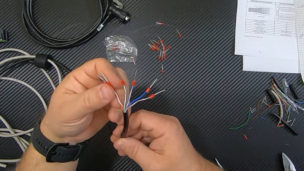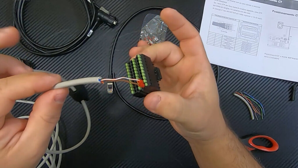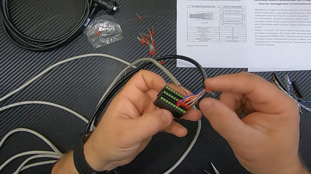 5 PER LA PREPARAZIONE del cavo di comunicazione BMS, sguainare il cavo e selezionare i conduttori Bianco/Arancio, Arancio, Bianco/Verde, Blu, Bianco/Blu e Bianco/Marrone. Arrotolare e raddoppiare tutti i sei fili e intestarli con i puntali in dotazione per una connessione sicura