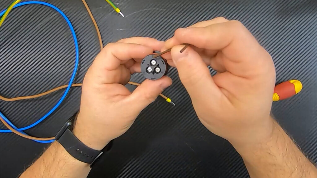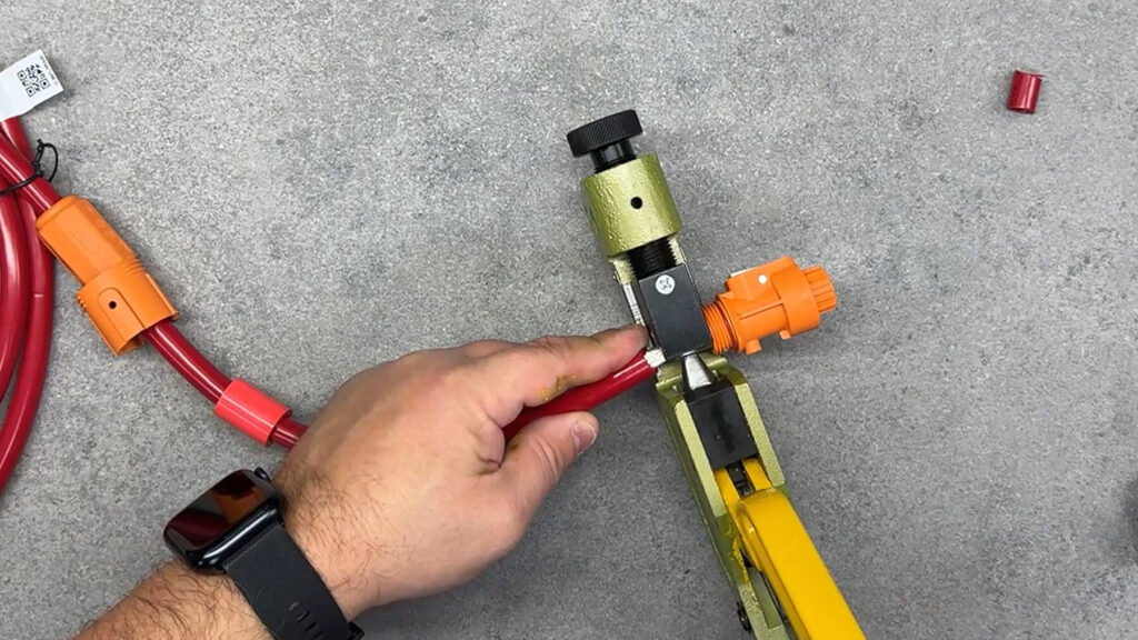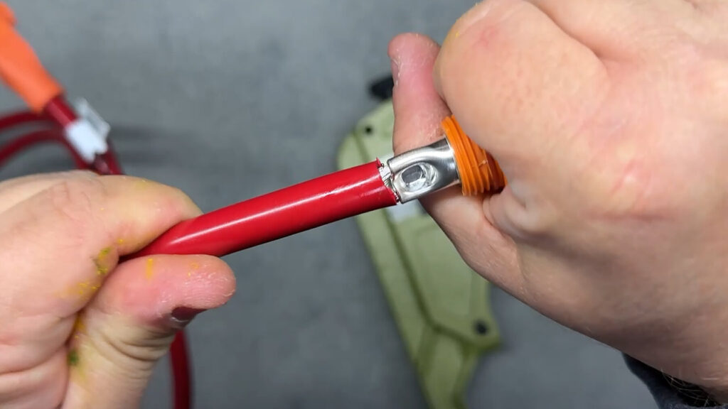 7 PREPARAZIONE del connettore di potenza batteria (lato inverter). Sguainare il cavo per circa 1 cm. La fase più critica è la crimpatura del cavo sul terminale metallico: è necessaria una pinza a crimpare idonea (matrice) per garantire un contatto elettrico perfetto e sicuro sotto alta corrente