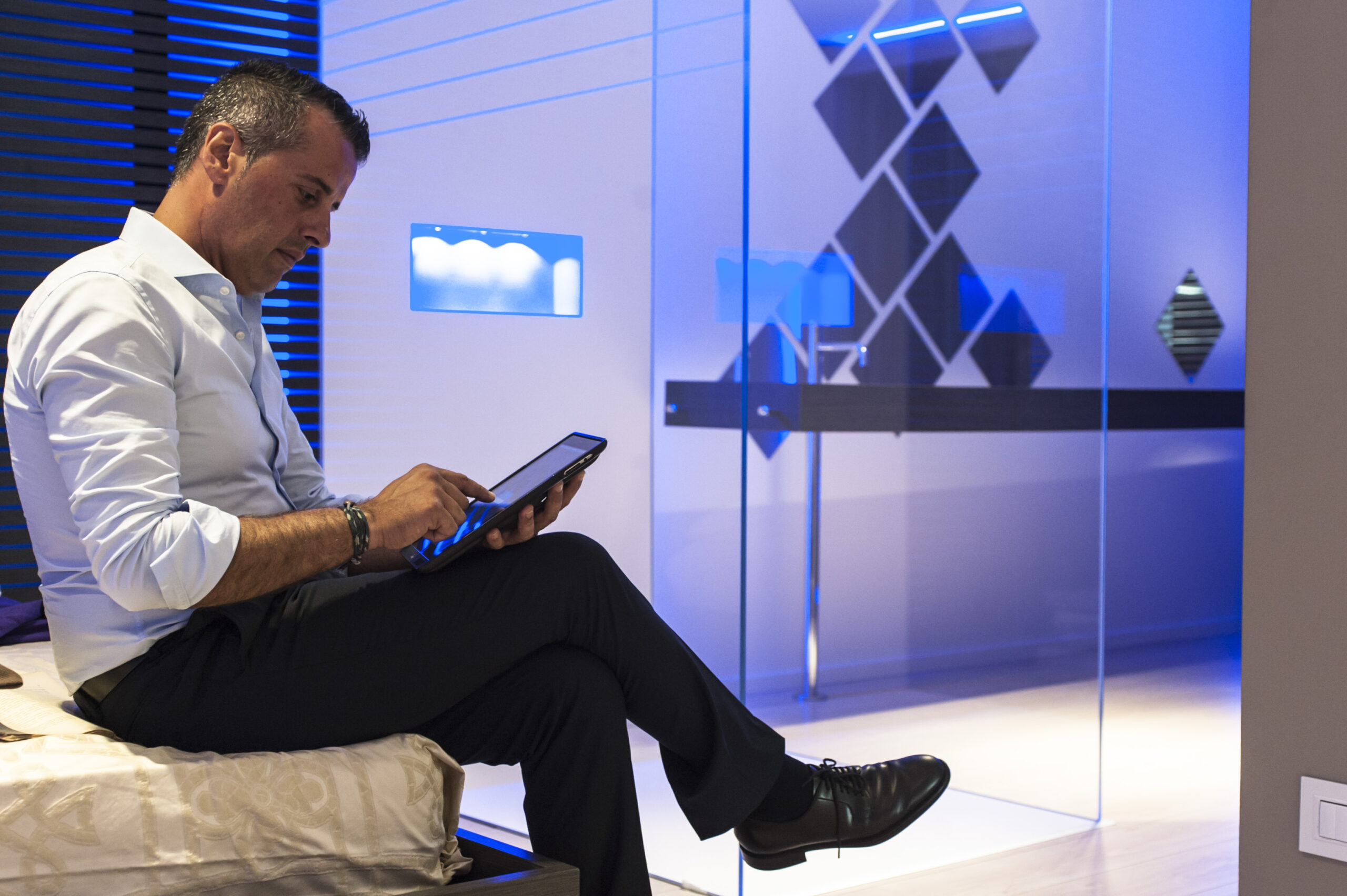 Remo Fullin, responsabile tecnico per Comoli-Ferrari del 3E Lab di Novara ha appena testato alcuni scenari domotici. Emanuele Lo Porto lo attende al piano di sotto, dove un grande divano accoglie professionisti e clienti interessati ad approfondire il concetto dell’integrazione di tecnologie, per vivere al meglio la propria abitazione o lo spazio di lavoro.