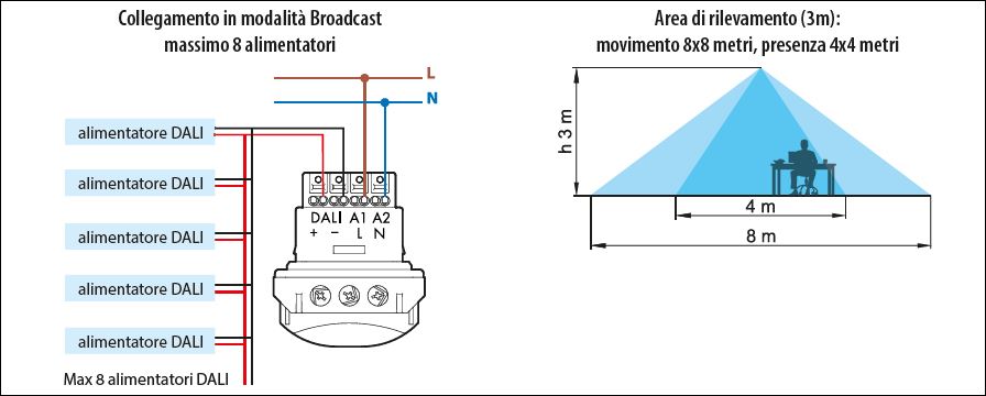 Rilevatore di movimento e presenza con interfaccia DALI: schema di collegamento e area di funzionamento del rilevatore (tipo 18.5D.8.230.0000 – cortesia foto: Finder)