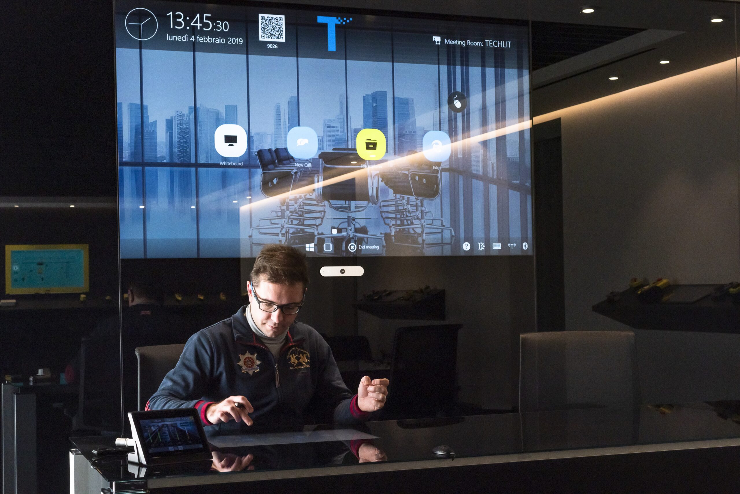 I monitor interattivi presenti in questa sala sono collegati a un’apposita rete che ne permette la gestione centralizzata. Una lavagna interattiva ricopre lo spazio dietro al tavolo dei relatori e alla sua destra: con una speciale penna ottica, il relatore può scrivere a mano delle note e vederle riportate sullo schermo principale, dove nel frattempo possono essere mostrati video, documenti o altre risorse multimediali. Al termine dei lavori, è possibile esportare in formato PDF i contenuti proiettati e condividere il video della sessione. La sala ospiterà meeting, corsi di formazione e, in prospettiva più ampia, sarà destinata ad accogliere di qualsiasi ospite che giungerà in sede