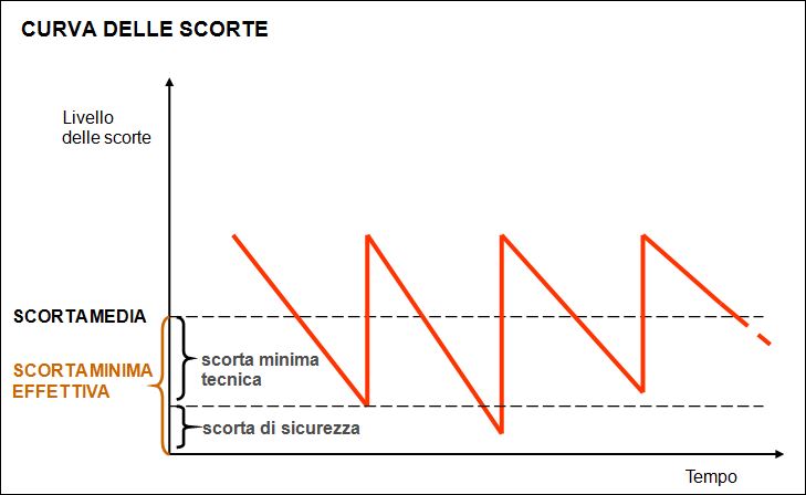 La scorta media è ricavabile dalla curva delle scorte di un dato articolo, prodotto o insieme di prodotti. Come illustrato in figura 1, la curva delle scorte comprende due livelli fondamentali di scorta: la scorta minima, antecedente il riassortimento e la consegna della merce, e la scorta massima, corrispondente alla quantità massima di merce presente a magazzino per ciascun articolo. La scorta minima effettiva dovrebbe comprende anche la scorta di sicurezza, e cioè la quantità di merce da tenere in scorta per far fronte alle ulteriori vendite che si verificano nel periodo di tempo che intercorre tra l’ordine e il riassortimento.