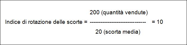 La rotazione delle scorte è data dal rapporto tra le quantità vendute di un determinato prodotto/articolo in un dato periodo di tempo e la scorta mediamente presente a magazzino durante tale periodo. Il riferimento a uno specifico periodo di tempo è ovviamente indispensabile per quantificare e dare un significato concreto ai numeri che se ne ricaverebbero. In mancanza di un preciso periodo di riferimento, il calcolo sarebbe infatti poco significativo e difficile da interpretare e confrontare. Facciamo un esempio: se le vendite di un dato prodotto ammontassero a 200 unità (a volume, quindi, e non a valore) e la scorta media presente a magazzino ammontasse a 20 unità, avremmo una rotazione pari a 10 (figura 2).
