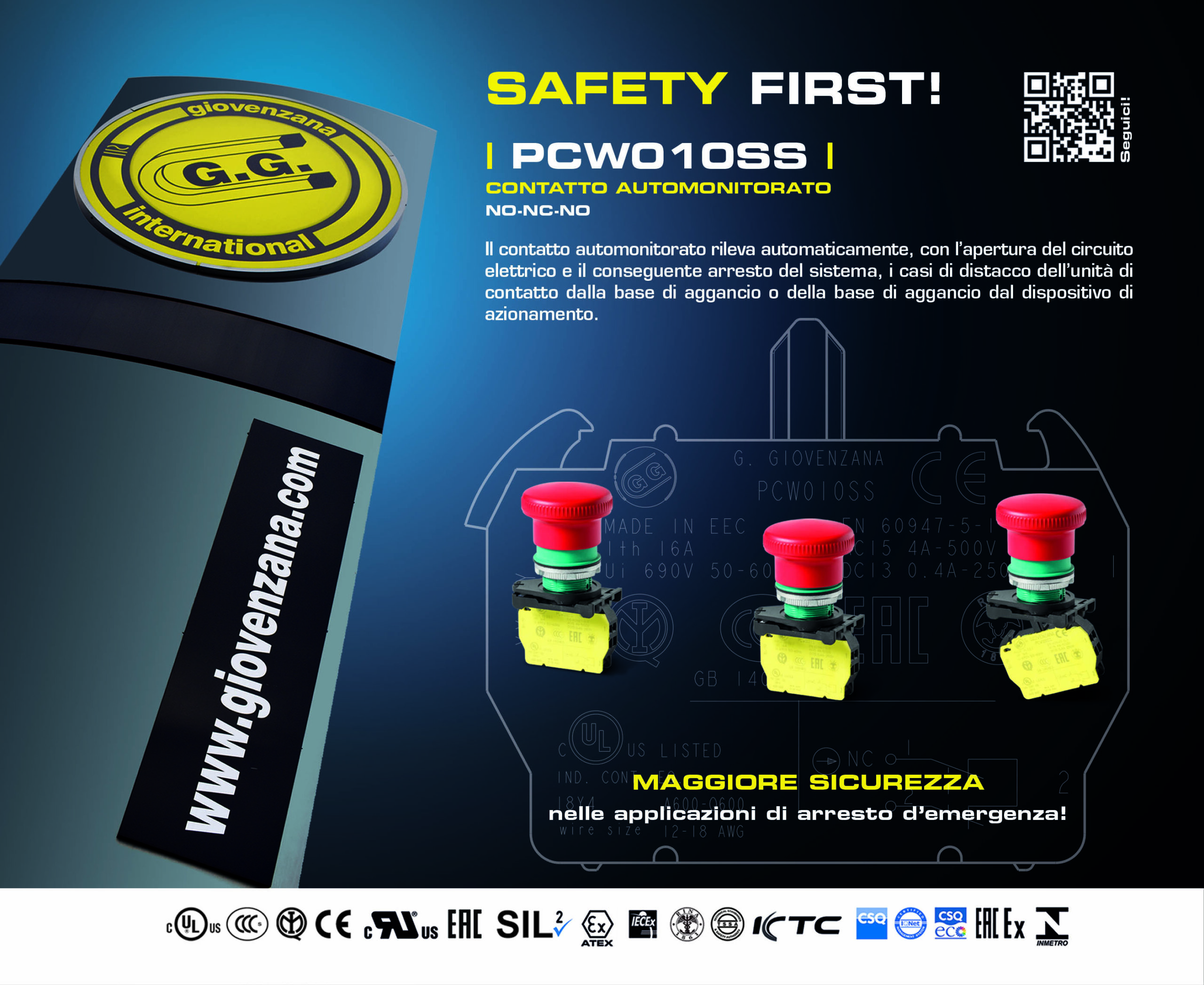 Un “testimonial” della capacità di progettare nuove soluzioni in tempi brevi è il nuovo contatto automonitorato PCW010SS, contatto automonitorato che rileva automaticamente, con l’apertura del circuito elettrico e il conseguente arresto del sistema, i casi di distacco dell’unità di contatto dalla base di aggancio o della base di aggancio dal dispositivo di azionamento. Il prodotto è conforme con le normative CEI EN 60204-1 e trova largo impiego sia in ambito industriale che ascensoristico. Il suo campo tipico d’utilizzo è quello delle applicazioni d’arresto di emergenza: se il blocco di contatti viene rilasciato accidentalmente dalla base rendendo inutile l’azionamento del fungo d’arresto, oppure in caso di incidenti in cui lo stesso viene accidentalmente divelto, il contatto NC si apre e interrompe l’alimentazione elettrica della macchina su cui è montato, evitando così il verificarsi di situazioni di potenziale pericolo.