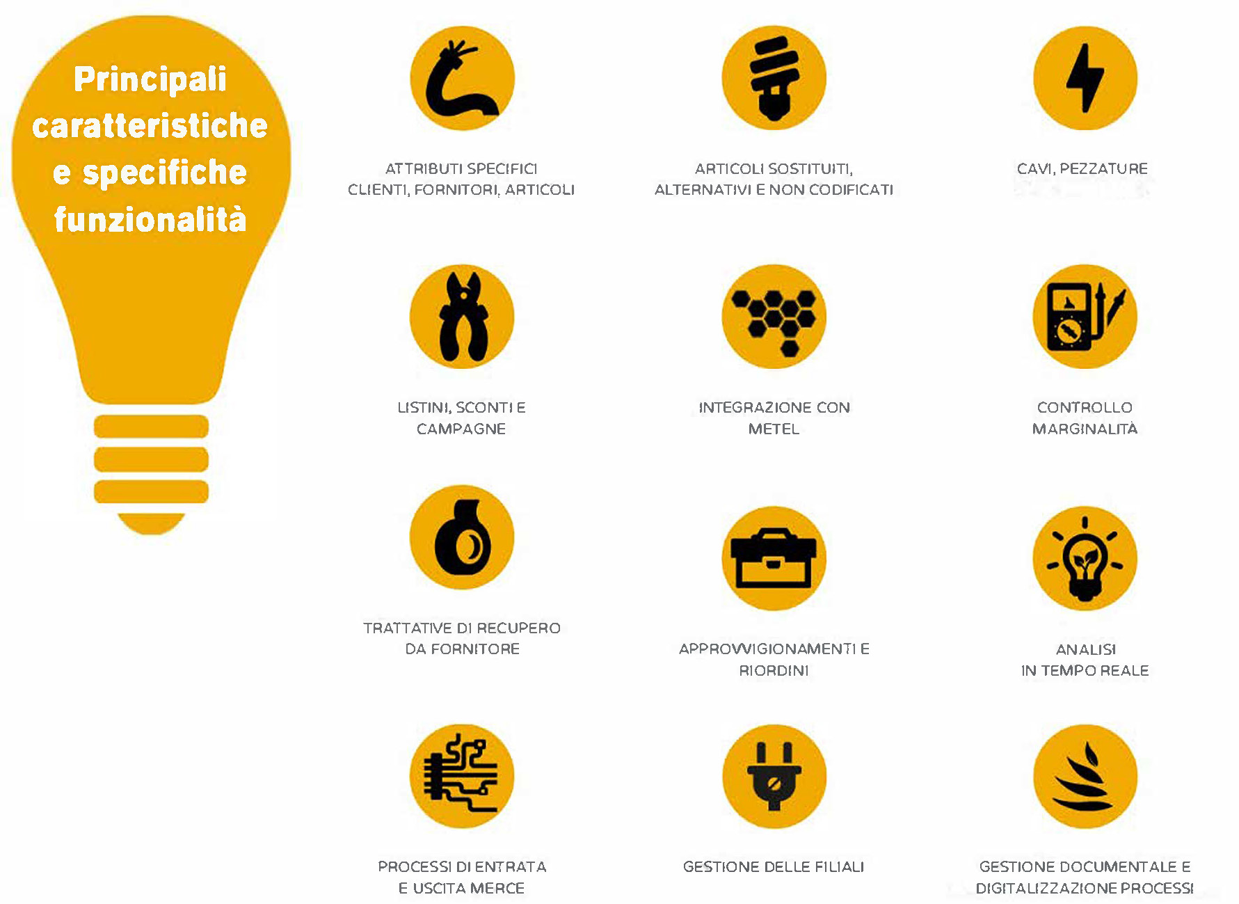 Integrazione: il gestionale integra tutte le funzionalità messe a disposizione da METEL, per la gestione di tutti i documenti gestiti nella filiera (listini, ordini, ddt, fatture, ecc.), l’utilizzo dei webservices per gestire disponibilità e ordini urgenti, lo standard ETIM per la classificazione dei dati tecnici degli articoli