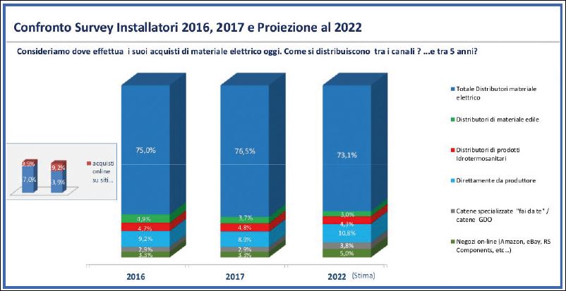 Dall’indagine quantitativa effettuata dall’osservatorio Sonepar Italia sugli installatori italiani emerge che tra il 2016 e il 2017 il 74% degli installatori dichiara di rivolgersi a distributori per le proprie forniture. Di questi, il 66% compra fisicamente materiale elettrico nei punti vendita. Lo stesso campione, proiettato al 2022, si abbassa a un 53,9%, ovvero il 12% delle stesse persone che oggi preferiscono il punto vendita si rivolgerà all’e-commerce. Oggi la percentuale di installatori che afferma di comprare on line la merce arriva a circa il 10% ma il 19,2% prevede di farlo in futuro. Se dunque si può condividere l’idea diffusa che c’è ancora poca reattività sulla comunicazione digitale da parte di molti installatori italiani, si deve altrettanto ammettere che i numeri evidenziano una chiara tendenza verso l’e-commerce.