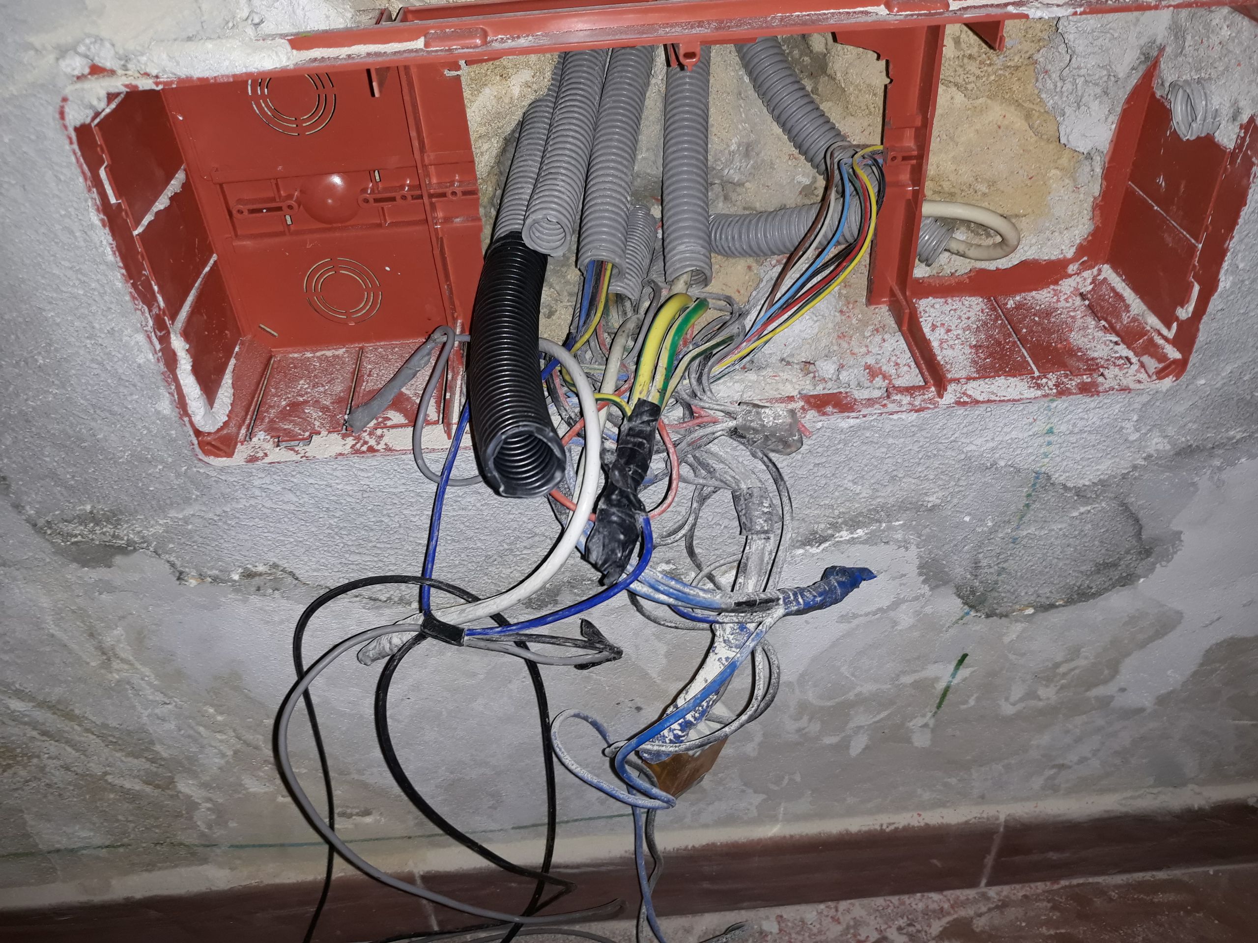 Cavi della corrente giuntati col nastro adesivo e nella stessa scatola (sfondata) anche antenna e citofono!