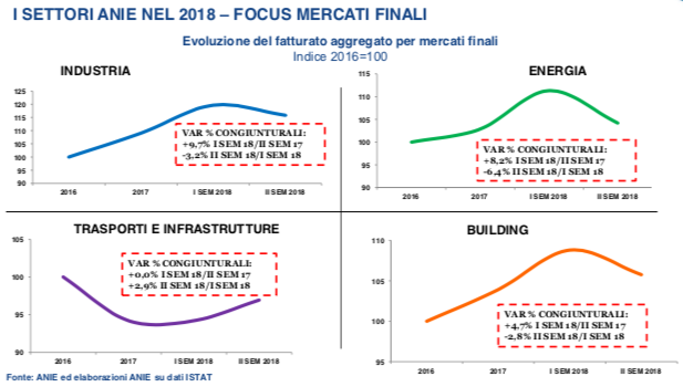 Nel 2018, l’andamento dei settori di ANIE Confindustria in termini di fatturato totale è stato caratterizzato da un diverso andamento dove, a una crescita sostenuta registrata nel primo semestre 2018, è seguita, nel semestre successivo, una brusca inversione di tendenza.