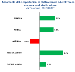 Guardando all’export, i settori di ANIE nell’intero anno 2018 hanno registrato ugualmente una crescita del 2,5% (dato preconsuntivo su base annua) beneficiando del positivo contributo della domanda in Europa (+5,5%) Africa (+5,0%) e Asia Pacifico (+8,4%). Negativo l’andamento delle esportazioni in America che calano del 3,4%. La frenata sul fronte delle esportazioni è riconducibile a uno scenario internazionale reso più critico dal neo-protezionismo, dalle tensioni finanziarie e monetarie.