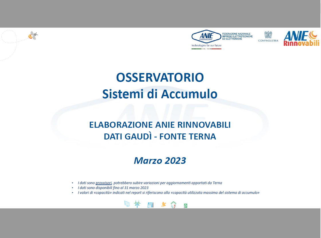 L’aggiornamento del report “OSSERVATORIO SISTEMI DI ACCUMULO” di ANIE Federazione presenta il trend delle installazioni di energy storage in Italia registrati dal sistema Gaudì di Terna (i dati sono provvisori, potrebbero subire variazioni per aggiornamenti apportati da Terna).