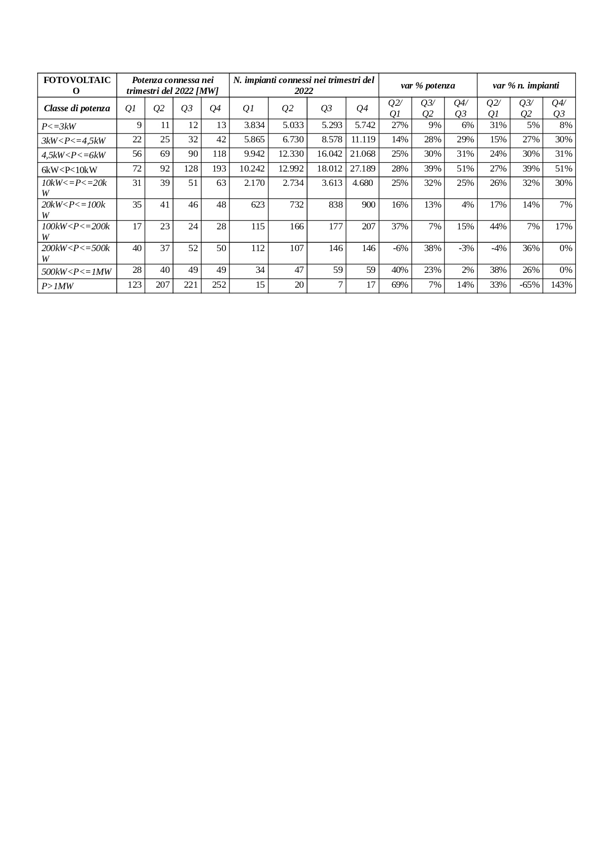 • il fotovoltaico è in costante crescita rispetto all’anno 2021 per quanto riguarda tutte le taglie;
