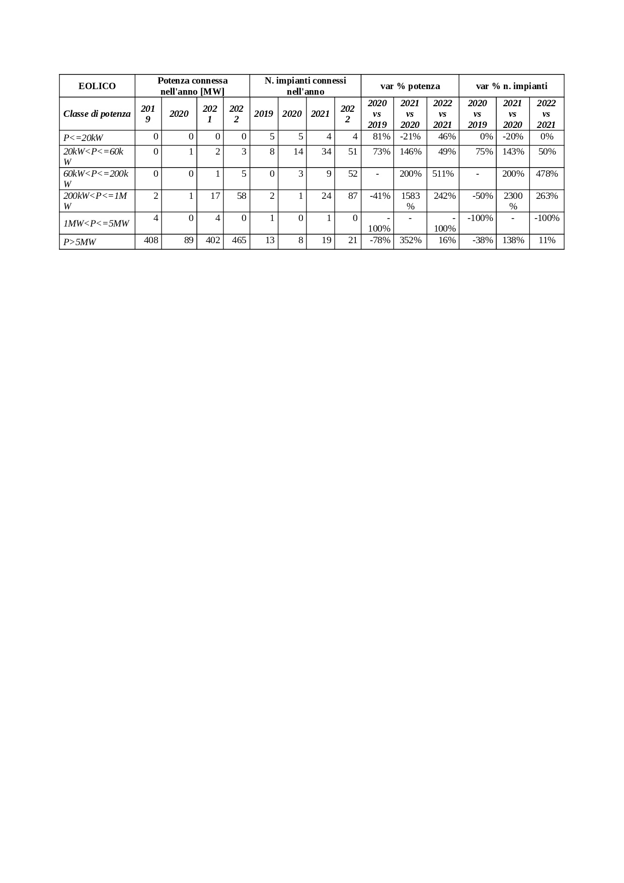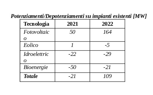 AnieUn piccolo contributo al risultato conseguito nel 2022 è dato dai potenziamenti degli impianti esistenti. Se nel 2021 si è assistito ad un decrescita della potenza degli impianti esistenti pari a complessivi -21 MW, nel 2022 il trend si è invertito ed ha registrato un aumento di 109 MW trainati dal fotovoltaico (+220%) e distribuiti come da tabella seguente:
