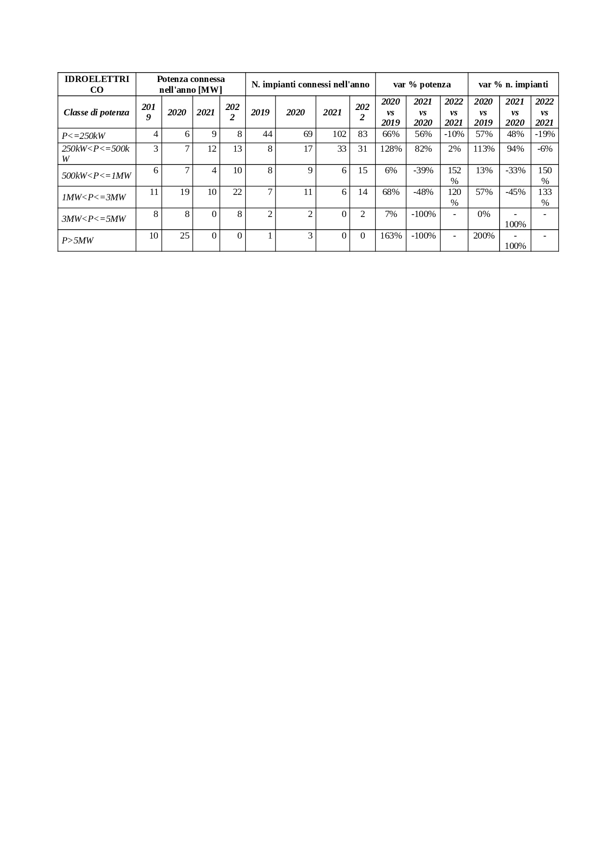 In crescita l’andamento dell’idroelettrico nel 2022 con 60 MW di nuova potenza connessa.