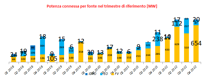 Focalizzandosi sul 4° trimestre 2022 le nuove installazioni di fotovoltaico, eolico, idroelettrico raggiungono complessivamente 761 MW (+42% rispetto al 4° trimestre 2021) con andamenti positivi per fotovoltaico (+130%) e idroelettrico (73%) e andamento negativo per il comparto eolico (-63%).