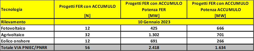 Analizzando i dati pubblicati sul portale del MASE (Ministero dell’Ambiente e della Sicurezza Energetica) risultano essere state presentate a fine anno 2022 istanze autorizzative per 996 progetti per complessivi 45.400 MW di FER tra eolico e fotovoltaico e 6.400 MW di accumulo tra elettrochimico e pompaggio. I procedimenti autorizzativi analizzati sono la Valutazione di Impatto Ambientale (VIA), l’Autorizzazione Unica (AU), il Provvedimento Unico Ambientale (PUA) e lo Scoping.
