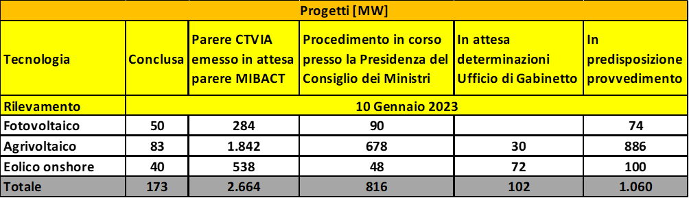 • per cui è stato emesso il parere VIA del MASE (non si evince se positivo o negativo) e si è in attesa del parere VIA del MIBACT (oggi MIC, Ministero della Cultura): 45 progetti per circa 3.300 MW
