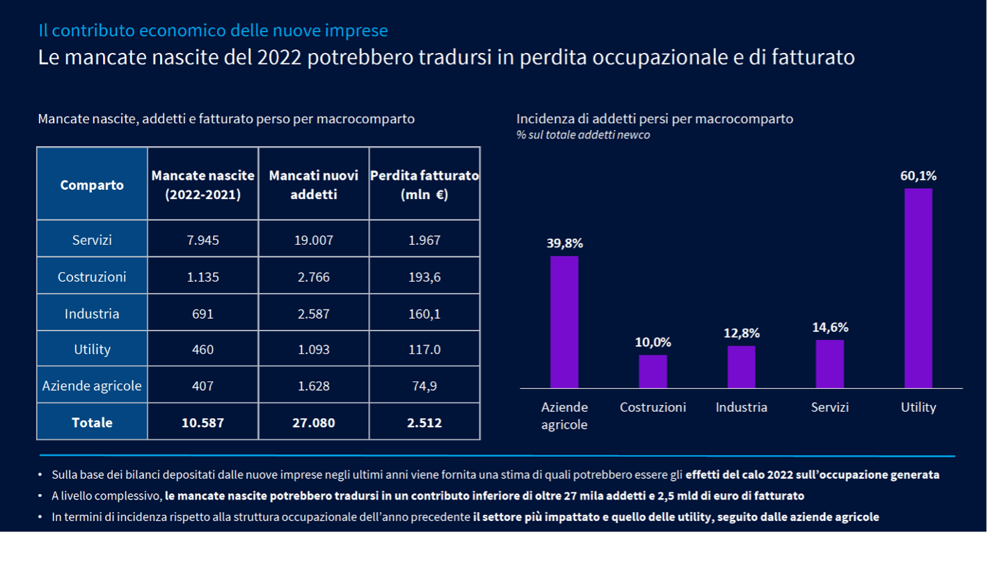 Entrando più nel dettaglio sulla stima dell’impatto che il calo di start-up del 2022 potrebbe avere sui diversi settori dell’economia, le più colpite rischiano di essere le utility (-117 milioni di euro di fatturato e -60,1% di addetti, a causa di 460 nuove nascite in meno), seguite dalle aziende agricole (-74,9 milioni di euro, -39,8% di addetti, -407 start-up), dai servizi (-1.967 milioni di euro, -14.6% di addetti che però in cifra assoluta si traducono in ben 19.000 persone, – 7.945 start-up), dall’industria (-160 milioni di euro, -12,8% di addetti, -691 start-up) e infine dalle costruzioni (-193,6 milioni di euro, -10% di addetti, -1.135 start-up), che avevano visto un vero e proprio boom nel 2021 grazie ai vari bonus edilizi. In totale, 27.080 lavoratori stimati in meno e una perdita di fatturato di oltre 2,5 miliardi di euro.