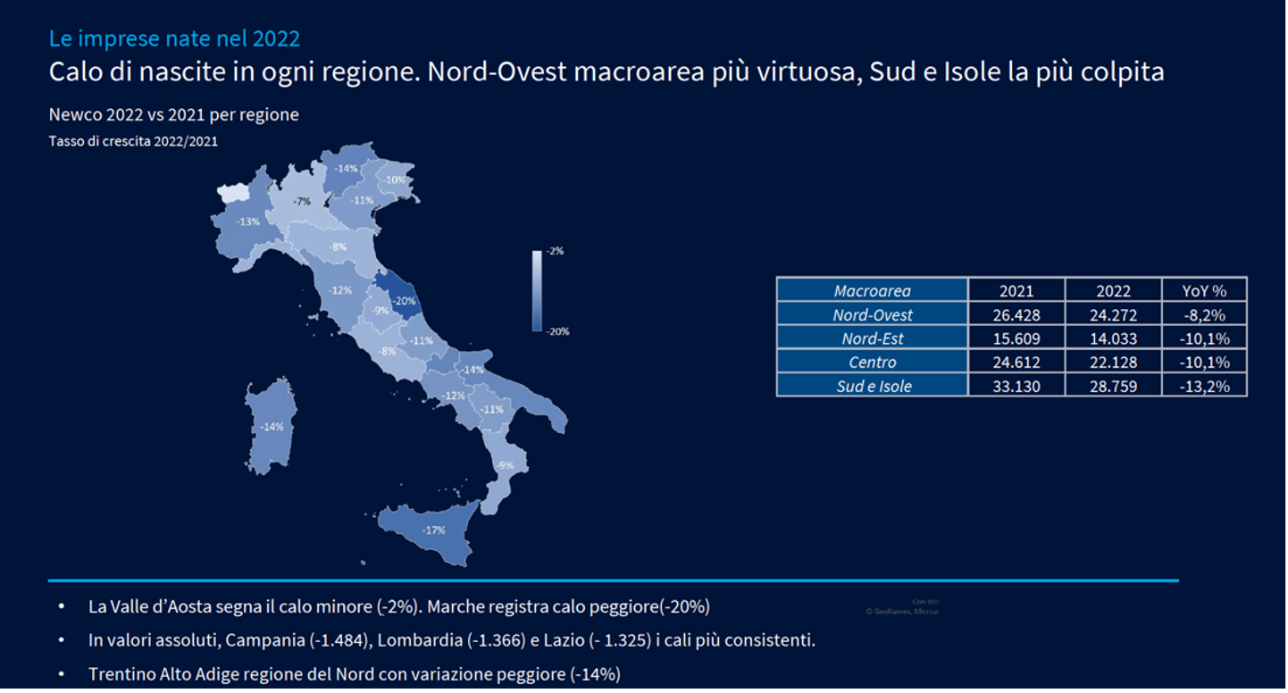 In cifra assoluta, nel Mezzogiorno le nuove imprese sono passate da 33.130 nel 2021 a 28.759 nel 2022 (-13,2%), al Centro da 24.612 a 22.128 (-10,1%; stessa percentuale del Nord Est, da 15.609 a 14.033), nel Nord Ovest da 26.428 a 24.272 (-8,2%). A livello regionale, la Valle d’Aosta segna il calo minore di nascite di imprese (-2%), mentre le Marche quello peggiore (-20%), a causa della crisi che ha investito i distretti del manifatturiero a partire dalla moda e dalle calzature. In valori assoluti, invece, sono la Campania (-1.484 aziende), la Lombardia (-1.366) e il Lazio (-1.325) ad avere subìto i cali più consistenti. Al Nord, la regione più impattata è il Trentino-Alto Adige (-14%).