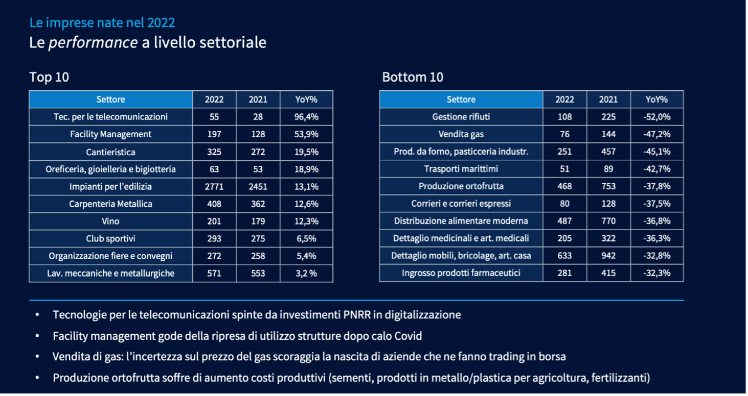 Venendo ai singoli settori, in cima alla top 10 dei più performanti troviamo le tecnologie per telecomunicazioni, spinte dagli investimenti del PNRR in digitalizzazione, che salgono dalle 21 startup del 2021 alle 55 del 2022 (+96,4%), il facility management, che ha goduto della ripresa di utilizzo delle strutture dopo il calo dovuto al Covid (da 128 a 197 startup, +53,9%), la cantieristica (da 272 a 325, +19,5%) e gli impianti per l’edilizia (da 2451 a 2771, +13,1%), trainati dalla domanda generata dal PNRR. Al contrario, tra i peggiori 10 ci sono la gestione dei rifiuti (da 225 a 108 startup, -52%), la vendita di gas (da 144 a 76, -47,2%), su cui ha pesato l’incertezza sul prezzo, i prodotti da forno e la pasticceria industriale (da 457 a 251, -45,1%), i trasporti marittimi (da 89 a 51, -42,7%) e la produzione di ortofrutta (da 753 a 468, -37,8%), che ha sofferto l’aumento del costo delle sementi, dei prodotti in metallo/plastica per l’agricoltura e dei fertilizzanti.