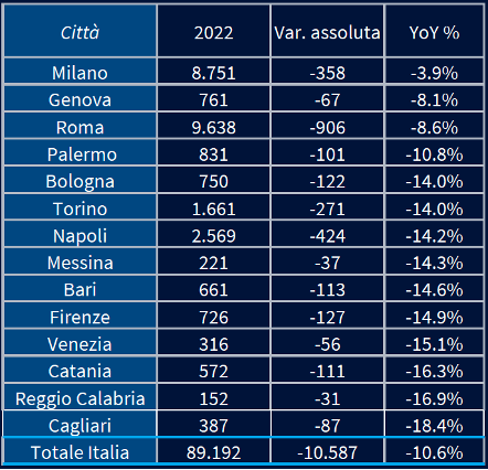 CervedAnalizzando le grandi città, si vede invece come Milano sia quella più dinamica, con un calo di “sole” 358 nuove imprese rispetto al 2021 (-3,9%), seguita da Genova (67, -8,1%) e Roma (906, -8,6%), mentre le successive hanno comunque un saldo negativo a due cifre: Palermo (101, -10,8%), Bologna (122, -14%) Torino (271, -14%), Napoli (424, -14,2%), Messina (37, -14,3%), Bari (113, -14,6%), Firenze (127, -14,9%), Venezia (56, -15,1%), Catania (111, -16,3%), Reggio Calabria (31, -16,9%), Cagliari (87, -18,4%).