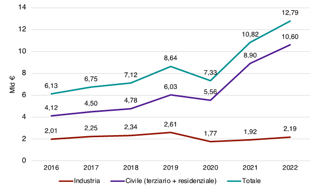 I costi energetici lievitati fino a 10 volte rispetto al periodo pre-Covid hanno dato un nuovo impulso, nel 2022, all’adozione di soluzioni di efficientamento dei consumi. A confronto con il 2021, già in crescita sul 2020, si registra un +19% di investimenti in ambito civile (saliti a 10,6 miliardi di euro, di cui però solo un quarto in soluzioni di building automation) grazie in particolare alle caldaie a condensazione e al fotovoltaico, le cui installazioni sono state favorite dai vari bonus edilizi e che vanno nella virtuosa direzione di produrre energia pulita, ma non di razionalizzarla.