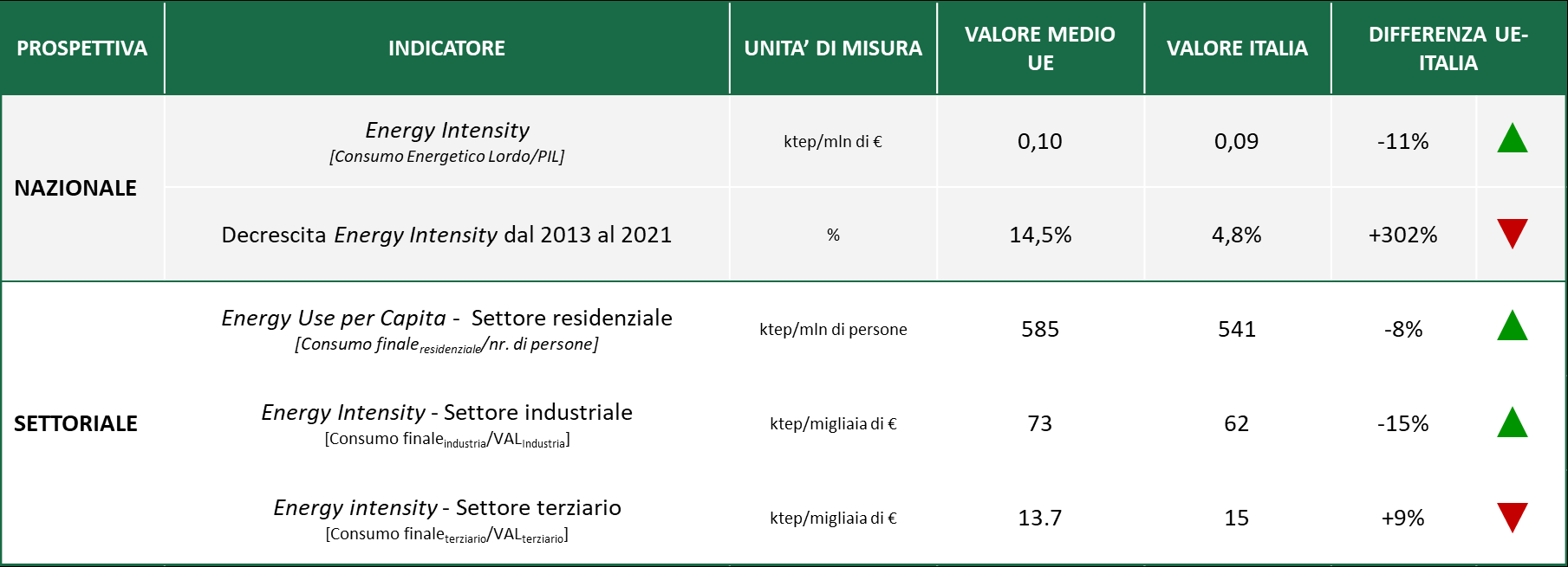 L’Italia, anche grazie al clima mite (ma scontando il quadro normativo meno efficace), si caratterizza per un buon livello globale di efficientamento energetico, al 14° posto tra i 27 Paesi appartenenti alla UE (progetto Odysee Mure) e con un valore medio in termini di Energy Intensity Index (rapporto consumi/PIL) inferiore di circa l’11% a quello europeo nel 2021; eppure, considerando il periodo 2013-2021, il miglioramento è tre volte più lento, tanto da “farci raggiungere” da Germania, Spagna e Francia.