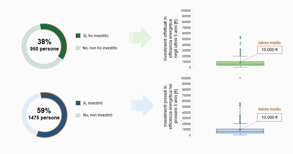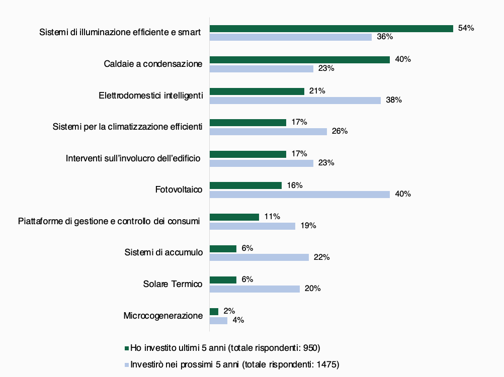Sebbene la maggior parte delle famiglie sia sensibile al tema della riduzione dei consumi, secondo una survey condotta da E&S su 2.500 cittadini solo il 38% di esse, negli ultimi 5 anni, ha installato soluzioni di efficienza energetica come caldaie a condensazione e illuminazione LED (scelti rispettivamente dal 40% e dal 54% di chi ha investito), pompe di calore o tecnologie per la produzione di energia da fonti rinnovabili, con una spesa media di circa 10.000 euro. I principali ostacoli all’adozione di queste innovazioni tecnologiche sono da ricercare nella difficoltà di accesso al capitale e nelle lungaggini burocratiche.