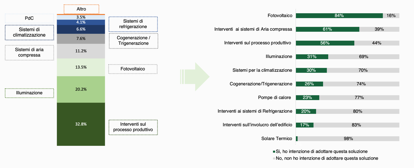 Lo stesso trend si riscontra nel settore industriale dove, secondo gli energy manager delle 250 imprese manifatturiere intervistate da E&S, barriere economiche (tempi eccessivi di ritorno) e burocratiche (incertezza del quadro normativo) costituiscono i principali elementi che frenano gli investimenti, soprattutto nell’ambito delle soluzioni hardware. Nel 2022, in ambito industriale, la scena è stata dominata da interventi sul processo produttivo e sull’illuminazione efficiente (LED), che insieme hanno superato il 50% del totale, mentre nel 2023, anno che si prevede di forte crescita degli investimenti in efficienza energetica, l’84% delle aziende dichiara che installerà nei propri siti produttivi un impianto fotovoltaico. L’efficientamento del processo produttivo (scelto dal 56% dei rispondenti) e dei sistemi di illuminazione (31%) manterranno comunque una notevole importanza.
