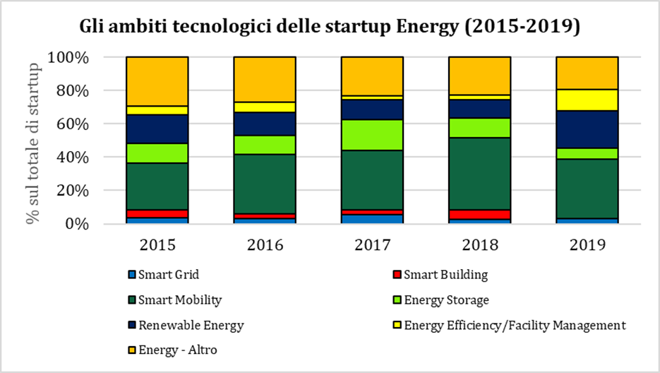Sono state analizzate 600 startup attive nel mondo Energy, di cui il 55,5% in Europa, il 41,3% negli Stati Uniti e il 3,2% in Israele. L’Italia, con 18 startup, è al livello di Israele, Spagna, Svizzera e Belgio, ma ha numeri nettamente inferiori rispetto a Germania (56 startup), Regno Unito (49) e Francia (47). Dal punto di vista degli ambiti, vi è una forte preponderanza delle startup attive nella Smart Mobility (204, 34% del campione), anche se in flessione nel 2019, seguite da quelle di Renewable Energy (88, 15% del campione) ed Energy Storage (78, 13% del campione). Scarsamente rilevanti risultano invece le categorie Smart Grid (23 startup), Smart Building (22) ed Energy Efficiency/Facility Management (28), ambito tuttavia significativo nel contesto italiano.