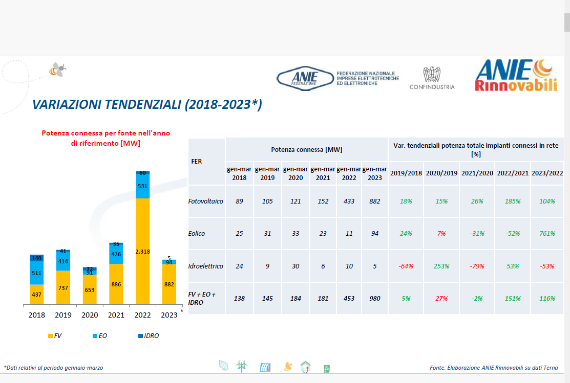 Cresce ancora il fotovoltaico nel 1° trimestre 2023 con 882 MW di potenza connessa.